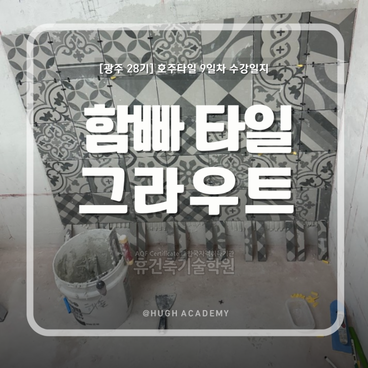 안녕하세요 휴건축기술학원입니다. 광주에서 진행 중인 호주타일 국비지원 과정 28기 수강생들의 9일차 실습 현장을 기록합니다. 이번 과정은 호주 현장 취업을 목표로 타일 시공 기술을 배우는 실무 중심 교육으로, 단순한 체험이 아닌 실제 현장에서 사용하는 작업 흐름을 반복하며 익히는 과정입니다. 같은 타일 작업이라도 기준선을 이해하고 시작하는 것과, 감으로 작업을 진행하는 것은 결과에서 큰 차이를 만듭니다. 이번 9일차 실습에서는 벽타일 시공을 이어가며 함빠 타일 처리와 그라우트 작업을 처음 경험한 하루였습니다. ※ 이 글은 28기 수강생들의 실제 수강일지를 바탕으로 구성된 실습 기록입니다. 이전 기록은 아래 링크에서....... <img src="https://blogthumb.pstatic.net/MjAyNjAzMDlfMjYz/MDAxNzczMDIxNzg4NDM5.pbrytZ03gZVtKpTOtX8y2ZxVdL7L3cMc7PyZUxKu_UMg.xltgD05SM0xsFDGylyfSYfwcGKHYwAiWPVqnkbGoi_4g.PNG/%B1%A4%C1%D6_28%B1%E2_%C8%A3%C1%D6%C5%B8%C0%CF_7%C0%CF%C2%F7_%BC%F6%B0%AD%C0%CF%C1%F6.png?type=s3" />