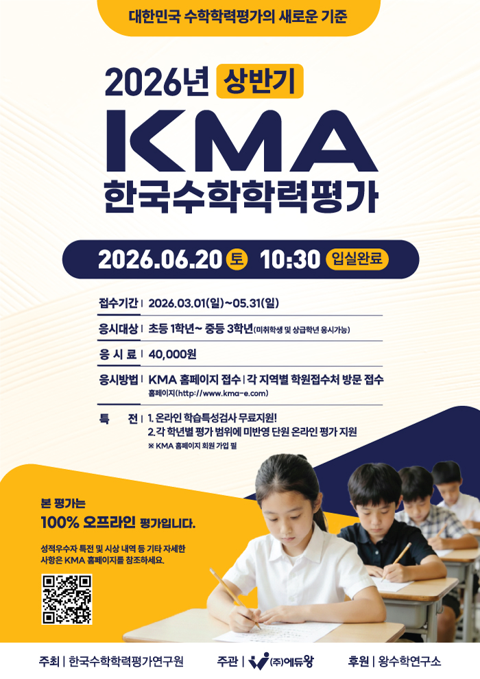안녕하세요! 2026 상반기 KMA 수학학력평가 일정입니다. 시험 당일에는 수험 표, 필기도구(OMR 작성용 사인펜 등) 등을 준비해야겠습니다^^ 평소 학교 교과 학습뿐 아니라 창의력 중심 문제 해결 능력을 향상시키는 것이 중요합니다. 과거 기출문제와 OMR 작성의 정확성을 꾸준히 연습해 두면 시험 당일 실수의 확률을 줄일 수 있습니다. KMA 수학학력평가는 초중학생의 수학 실력을 객관적으로 평가할 수 있는 좋은 기회입니다. 경쟁보다는 자기 수준 점검과 성장에 초점을 두고 준비해 보아요~ <img src="https://blogthumb.pstatic.net/MjAyNjAyMjdfMTk3/MDAxNzcyMTc3Nzg2MDAx.o5dixolBCcOGuQQnu2FY8Cs9F3VC-d2uqVKgjvQOy-kg.GKZXeS2XOxhpcJR4dqYsp5mcqZSbcuDmkUoodLSt9GQg.JPEG/26%B3%E2-%BB%F3%B9%DD%B1%E2-KMA%C6%F7%BD%BA%C5%CD-%28%C0%CE%BC%E2%BF%EB%29-%C0%C0%BD%C3%B4%EB%BB%F3-%BC%F6%C1%A4.jpg?type=s3" />
