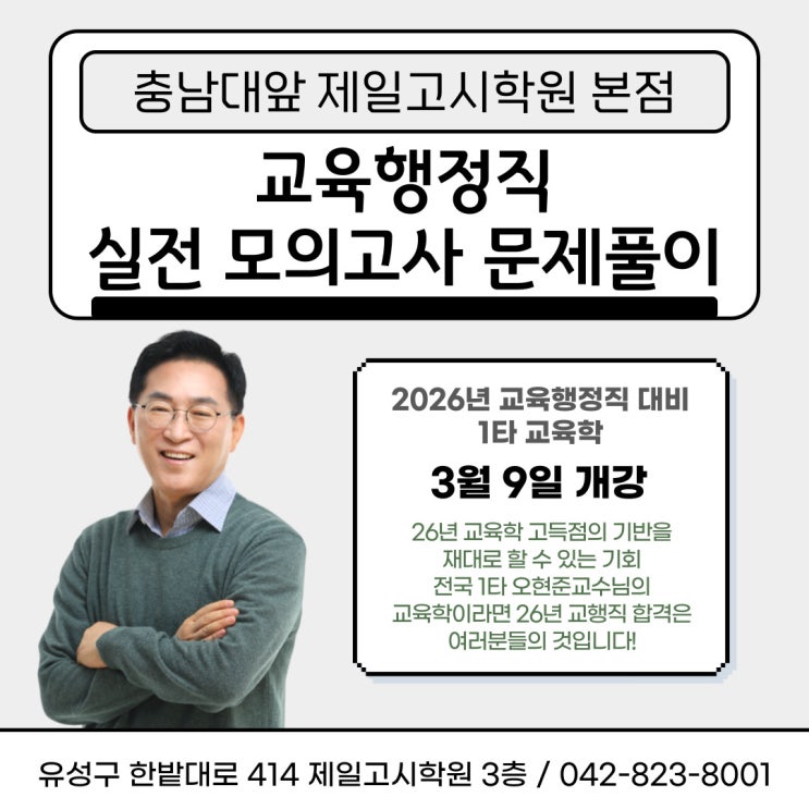 안녕하세요 ! 제일고시학원 (본점) 입니다 ! 2026년 교육행정직 대비 오현준 교육학 진도별 + 동형 모의고사 문제풀이 3월 9일 개강 안내입니다. 교육학 문제풀이를 통해 문제풀이 과정으로 실전연습을 합니다. 교육행정직을 준비하는 학생이라면 오현준 교육학 강의는 거의 필수입니다! 내가 공부한 이론을 총정리 하면서 문제풀이로 실전대비가 가능합니다. 초시생도 재시생도! 무조건 들어야합니다. 교육행정직 실전 모의고사 문제풀이 제일고시학원에서는 신유형 출제기조 변화와 최근 기출유형을 완전 분석하며 반영합니다. 오현준 교수팀을 선택한다는건 출발선이 앞서 있다는 것! 교육학은 진도별 동형모강 문제풀이가 진행됩니다. 2....... <img src="https://blogthumb.pstatic.net/MjAyNjAyMjdfMTky/MDAxNzcyMTUzOTAyMTgw.Wi8QskJJSkku5Bkvxsko4ZlRIO8vctrPXnjEI5DanyUg.Z8Wu0k-2EzJeJRTb100lyiyWCOoEw_2RWOC2PiAT7KIg.JPEG/%C1%A6%B8%F1%C0%BB-%C0%D4%B7%C2%C7%D8%C1%D6%BC%BC%BF%E4_-001_%283%29.jpg?type=s3" />