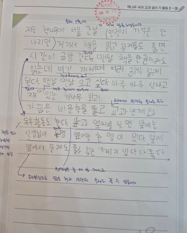 안녕하세요! 책나무 도담 독서논술학원 원장 도담쌤입니다 ^^ 저는 매달 말일이 되면 모든 학부모님께 한달 간 진행한 우리 친구들의 학습에 관한 이야기와 함께 다음 달 진행 될 학습 계획에 대한 내용을 전달 드리고 있습니다. 이 작업을 매달 하면서 물론 힘이 들기도 하지만... 제가 얻을 수 있는 몇 가지가 있더라구요. 가장 큰 이점은 우리 친구들이 한달 간 진행한 학습 진도를 체크할 수 있다는 점이고, 행여나 진도에서 누락되거나 빠지는 부분들을 원장인 제가 직접 체크할 수 있다는 점이 가장 좋은 것 같습니다. 그러다가 간혹... 보물같은 편지나 글들을 발견하기도 하는데요 ^^ 오늘은 그 아름다운 이야기를 함께 나누어볼까 합니....... <img src="https://blogthumb.pstatic.net/MjAyNjAzMDFfMTEg/MDAxNzcyMzM3ODYyMDE2.Hl5Qlf2EuUxRVJzML1_Ux75Gxn1Ivx5IMM6wsssiTXMg.92RsCGJB-BpZc_eD6xrQubjhYwosyo8YTzlFmgkTPqcg.JPEG/KakaoTalk_20260301_130340877.jpg?type=s3" />