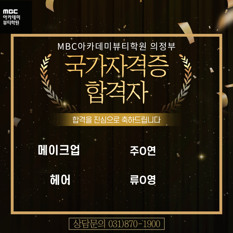 안녕하세요! #의정부미용학원 #동두천미용학원 #노원미용학원 #양주미용학원 #옥정미용학원 MBC아카데미뷰티학원 의정부점입니다:D https://new.mbcbeauty.co.kr/?campus=ujb 저희 학원은 개인학원이 아니니 안심하세요 MBC아카데미뷰티학원 의정부지점 수강생 분들의 합격소식을 알려드리려 왔어요! <미용사 국가자격증> 실기시험 합격을 진심으로 축하드립니다!! 열심히 노력한 성과를 얻으신 것 같아 너무너무 기쁘고 뿌듯하답니다 자격증 취득은 취업이나 창업 등에 반드시 필요한 과정임과 동시에 좀 더 확실한 미래 목표를 잡을 수 있게 도와주고, 또 결과를 눈에 보이게 만들어 성취감을 얻을 수 있다는 장점까지 있죠. 어느모....... <img src="https://blogthumb.pstatic.net/MjAyNjAzMTlfODQg/MDAxNzczODk3OTk3ODM2.oXRw6zxd6jZ1ch23IO81PywIC9k0vFu0BKoPUlSEq5sg.m-4x5Tjn8FwxcYKcuO_JYVITR5h0UyFJuEZByQI5OPIg.PNG/%C1%A6%B8%F1%C0%BB_%C0%D4%B7%C2%C7%D8%C1%D6%BC%BC%BF%E4..png?type=s3" />