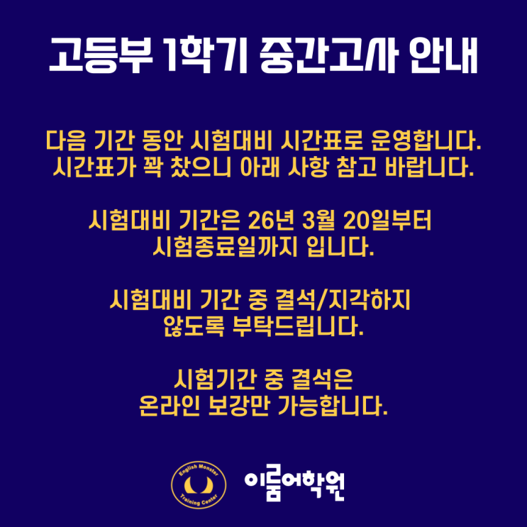 박달동 영어학원 [이룸어학원] 고등부 26년 1학기 중간고사 시험 대비 수업 안내