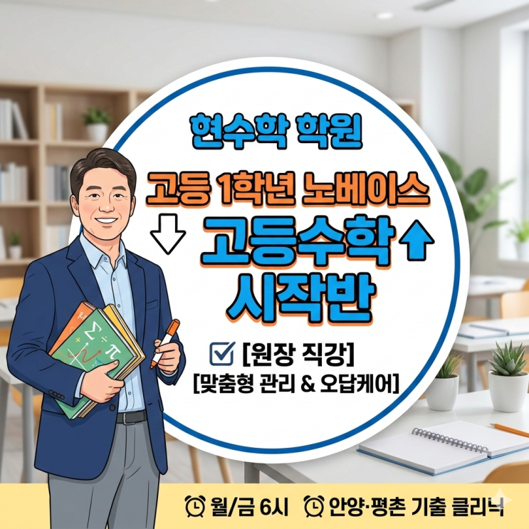 안녕하세요! 평촌 학원가의 교육 열기 속에서 우리 아이들의 수학 성적 때문에 고민이 많으신 학부모님과 학생 여러분 평촌수학학원 현수학 학원 원장 평촌입시김쌤입니다. 고등학교 입학 후 첫 시험을 앞두고 "중학교 때 수학을 놓았는데 지금 시작해도 될까?" "기초가 없는데 진도를 따라갈 수 있을까?" 고민하는 소위 '노베이스' 학생들을 위해, 제가 직접 발 벗고 나섰습니다. 단순한 강의를 넘어 성적의 반전을 만드는 [고1 수학 원장직강 시작반]을 소개합니다. 늦었다고 생각할 때가 가장 빠를 때입니다 고등 수학은 양이 방대하고 개념이 복잡 합니다. 하지만, 누구에게, 어떻게, 배우느냐에 따라 결과는....... <img src="https://blogthumb.pstatic.net/MjAyNjAzMDlfMzUg/MDAxNzczMDM0NTEwMTMy.g-1MLFZGrx8Bh5UNyg-DnfDzpjja825MBAwncr6XMFsg.ys4MwuzgYJleTb5b-cP9Eixi-3XvZ-qMKdqukq_ns8Ug.PNG/Gemini_Generated_Image_7zdue87zdue87zdu.png?type=s3" />