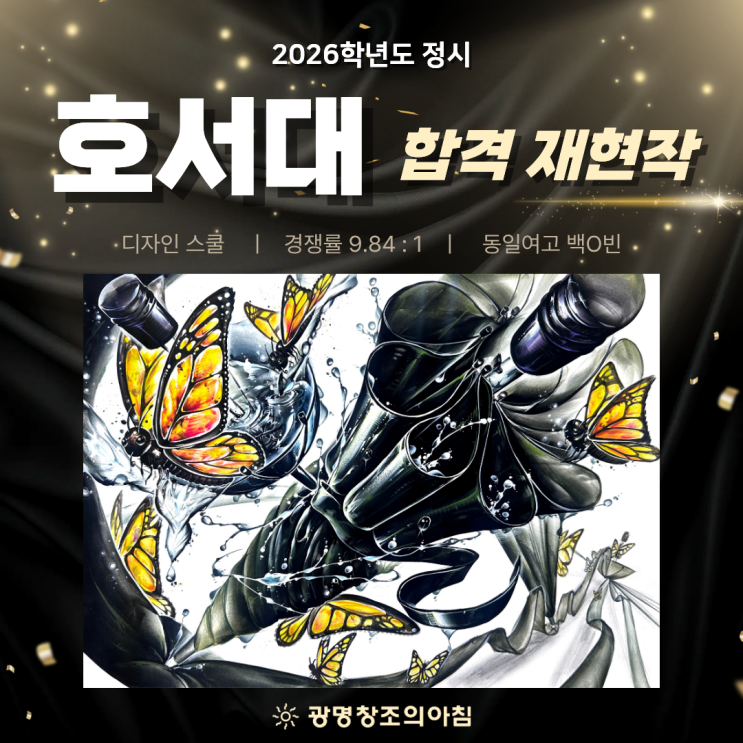 광명미술학원 호서대 정시 기초디자인 합격작 호서대학교 입학 https://ipsi.hoseo.ac.kr/submenu.do?menuurl=4YdTNEbm%2BFbZTe%2B07KCQbQ%3D%3D 호서대 합격자 발표는 어디서 확인하는지 헷갈리시는 분들을 위해 호서대 입학처 사이트 같이 올려드립니다. 2026학년도 호서대 디자인스쿨 정시 주제 제시된 이미지를 활용하여 자유롭게 표현하시오. 제시물 : 우산 + 나 호서대 합격 2026학년도 호서대 정시 합격작 한 번 구경하고 가세요~ 합격수기 2026 호서대 합격생의 합격수기 입니다. 지원한 전형/학과의 지원 동기는 무엇이며, 어떻게 준비했나요? 디자인 스쿨이 학부이기에 많은 학과들을 접하고 경험해 보는 것에 관심을 가져 지원하....... <img src="https://blogthumb.pstatic.net/MjAyNjAyMjFfOTMg/MDAxNzcxNjMyNDIwMDky.CkFSRoFwCc6cDy9EBTaGdJx2rBOqtSc8xN1wclpJq-og.vaAqh-PKFkbzNEfLPZ5340ZJCU63hxKr18NP0pungeQg.PNG/KakaoTalk_20260220_140442039.png?type=s3" />