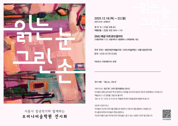 배곧 오미나미술학원에서 시흥시 청년작가들과 함께하는 전시회를 아트큐브 갤러리에서 하게 되었습니다! 우리친구들 너무 수고 많았어요! 작가님들도 협조 감사드립니다 <img src="https://blogthumb.pstatic.net/MjAyNTEyMDlfOTIg/MDAxNzY1MjUxMTQ1MTE3.4OlYZ8ej_Wtol7lg481xEoCY1H3ZOPhBPoCIRusdt90g.a7C7VWSVU3ZGUpjMoMvovGNqG35U0cww4sOj3xI_uTMg.JPEG/3472598284112875616.jpg?type=s3" />