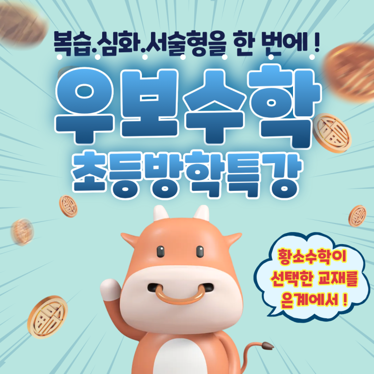 안녕하세요. 명이풀입니다. 예습, 복습, 심화 모든 것을 아우르는 초등 방학특강 안내드립니다. ✨ 4-2, 5-1 우보수학 [분수(소수) 특강] 대상 : 5-1 과정 1회독 이상 학습한 초등생 (학년 무관, 4~6학년 추천) 수업일정 : 2026.01.12(월) ~ 02.13 (금), 15회 시간 : 오전 9시 40분 ~ 11시 교육비 : 18만원 (교재 개별준비) ✨ 4-2, 5-1 우보수학 [기하 특강] 대상 : 5-1 과정 1회독 이상 학습한 초등생 (학년 무관, 4~6학년 추천) 수업일정 : 2026.01.12(월) ~ 02.13 (금), 15회 시간 : 오전 11시 10분 ~ 12시 30분 교육비 : 18만원 (교재 개별준비) 분수특강/기하특강 모두 등록시 교육비 30만원 우....... <img src="https://blogthumb.pstatic.net/MjAyNTEyMTdfMTQ5/MDAxNzY1OTA0NTc3NDk0.cP-v5puTwiFZaVpJjsu6bSEN4uLjVvhxp13wo7ZOfKgg.GuIyvWoTrQxaXfNIWg1IDhB1a0KmBw1iXx8iqguBJxsg.PNG/%BF%EC%BA%B8%BC%F6%C7%D0%C6%AF%B0%AD.png?type=s3" />