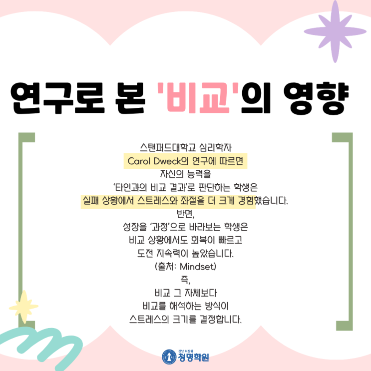 안녕하세요, 최상위 청명학원입니다. 공부를 하다 보면 많은 학생들이 한 번쯤 이런 생각을 합니다. “나는 왜 이 정도일까…” 특히 친구들의 성적, 합격 소식, 빠른 결과들을 보게 되면 자연스럽게 자신과 비교하게 되고 그 과정에서 스트레스를 느끼는 경우가 많습니다. 그래서 오늘은 비교가 힘든 이유와 스트레스를 줄이는 방법에 대해 이야기해 보겠습니다. 비교가 힘든 이유는 무엇일까요? 친구의 성적이나 결과를 보게 되면 우리는 자연스럽게 나와 비교하게 됩니다. 하지만 비교가 힘든 이유는 우리가 ‘결과만 보고 판단하기 때문’입니다. 각자의 출발선, 노력의 시간, 환경은 모두 다른데도 우리는 가장 잘 나온 결과와 현재의 나를....... <img src="https://blogthumb.pstatic.net/MjAyNjAzMTdfMjc2/MDAxNzczNzMxNjk2MTI0.JlaeymVkKtGDWUjgm4rdtZT2wFiv1Kda7KZGMHtE448g.V5muOWBsTcuGRMHxGeKYLTMPNOHjCX1_wUyAg0aSGT8g.PNG/214213.png?type=s3" />