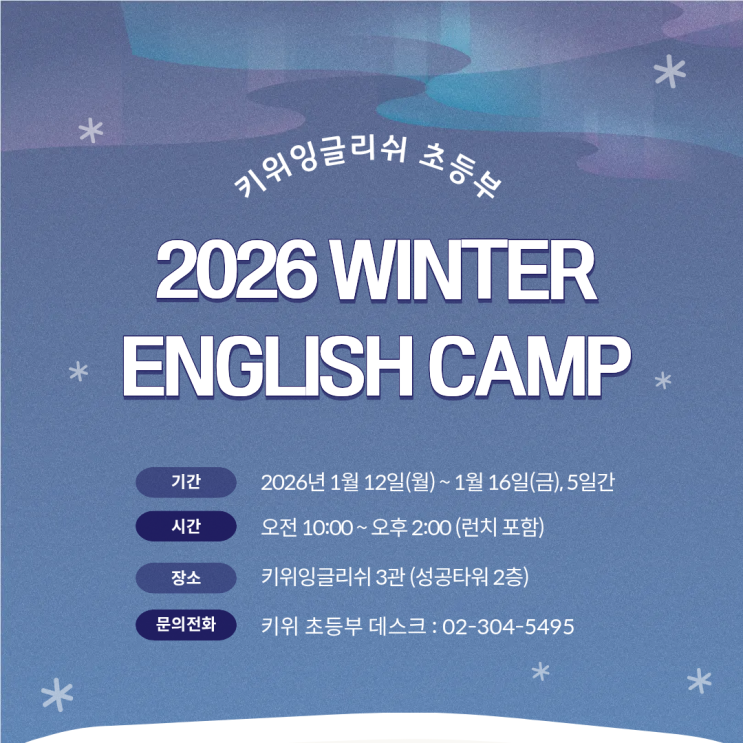 안녕하세요. 아이들이 즐거운 원어민 어학원 가재울영어학원 키위잉글리쉬입니다. 겨울방학을 앞두고 "이번 방학엔 우리 아이가 어떤 배움을 경험하면 좋을까?” 생각하시는 부모님들이 많으실 텐데요. 그래서 키위잉글리쉬는 매년 이 시기에 아이들이 가장 즐거워하고 성장도 놓치지 않는 키위만의 시그니처 프로그램 Winter English Camp를 준비해왔습니다. 그리고 마침내 2026년! 초등부 윈터캠프 일정이 확정되어 학부모님께 가장 먼저 알릴 수 있게 되어 기쁩니다. 단순한 겨울 특강이 아닌 영어에 몰입하는 시간 키위의 캠프는 문제풀이 중심 수업이나 단기 특강이 아닙니다. 아이들이 움직이고, 만들고, 협력하고, 표현하며 영어를 자....... <img src="https://blogthumb.pstatic.net/MjAyNTEyMTFfOTEg/MDAxNzY1NDQ3MDA2NTIx.vGiYsM-aqJuS0AL71Eusd8ZmddAKfEkzIpWvXjf8SsEg.ZYbHSUNxmDFYal8Tpi-tQGD5MXFfxvrXUdJ-P2CSvzQg.PNG/%B0%A1%C0%E7%BF%EF%BF%B5%BE%EE%C7%D0%BF%F8%26nbsp%3B%C5%B0%C0%A7%C0%D7%B1%DB%B8%AE%BD%AC%26nbsp%3B2026%26nbsp%3B%C3%CA%B5%EE%BA%CE%26nbsp%3B%C0%A9%C5%CD%C4%B7%C7%C1%26nbsp%3B%C0%CF%C1%A4%26nbsp%3B%BE%C8%B3%BB_%282%29.png?type=s3" />