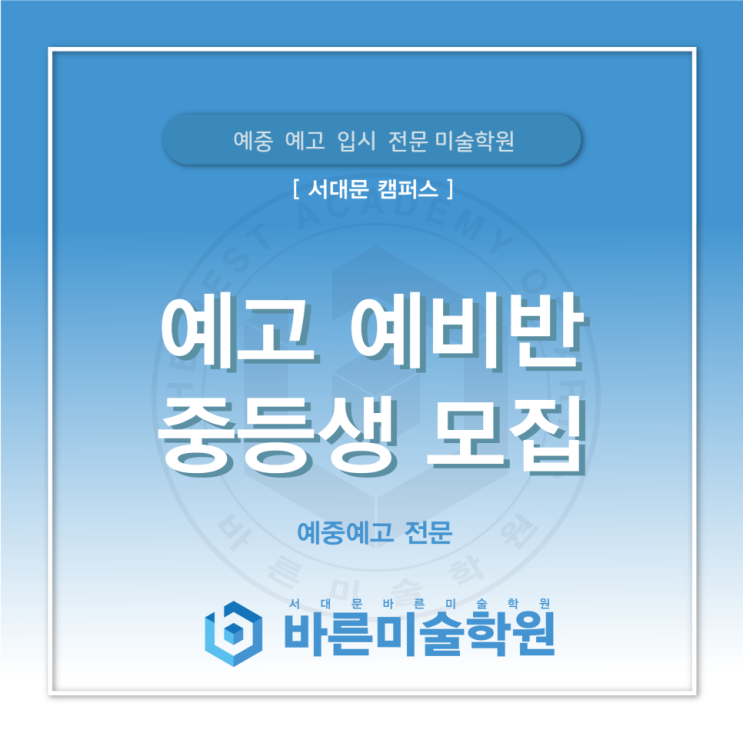 안녕하세요! 서대문바른미술입니다. 오늘은 서대문바른미술의 2026학년도 예고 예비반 모집 소식을 알려드리려고합니다. 서대문바른미술학원은 홍제역 인근에 위치한 예중예고 입시미술학원으로 소수정예로 구성되어있습니다. 바른미술 예중입시 지난해 결과 서대문바른미술은 미술에 꿈을 가진 학생들을 열정적으로 교육합니다. 서대문 바른미술학원에서 예중입시예비반 학생들을 모집합니다 !! 초등 6학년~중등2학년 약간 명 모집중 우리 서대문바른미술은, 첫째, 원장선생님의 직강으로 소수정예인만큼 각각의 수강생들에게 집중 교육 할 수 있습니다. 둘째, 오랜 경력의 선생님들의 교육을 통해 실기 실력과 함께 학생의 성적 관....... <img src="https://blogthumb.pstatic.net/MjAyNTEyMTVfMTE4/MDAxNzY1NzgyMjg0NzQ4.40gMtcU2J5gU4ZyaV_4aJxIOda87YVd3opQx4pKnenUg.eBmeJ_PBfH80dihhqJwqhG8N3GQV8zcO9v33WTCrPlMg.PNG/%B9%D9%B8%A5%B9%CC%BC%FA_%BA%B9%B1%B8%B5%CA.png?type=s3" />