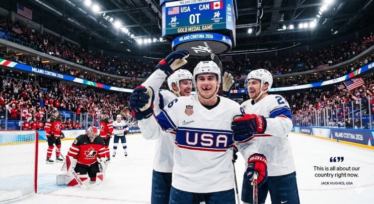 The U.S. has beaten Canada 2-1 at the Milan Cortina Olympics, earning the team a gold medal. American Jack Hughes scored in overtime. Unlike the group of college kids who pulled off the "Miracle on Ice" in 1980, this U.S. team this year was a roster full of NHL players, but they were still underdogs against the Canadians. Hughes says, "This is all about our country right now." He lost at least one front tooth, taking a high stick during the game. I'm Donna Warder. 1️⃣ The U.S. has beaten Canada 2-1 at the Milan Cortina Olympics, earning the team a gold medal. 첫....... <img src="https://blogthumb.pstatic.net/MjAyNjAyMjdfMTM4/MDAxNzcyMTU0MTY5ODYw.LmMh0vBZrYJ_AFO9FXkvrPydSE2QWOUiBbjbXxtxxiog.3jTbRuyd2_I17oOy_6cFjOQcTPOHHb2AgGyhRl7f2RIg.JPEG/unnamed_%2874%29.jpg?type=s3" />