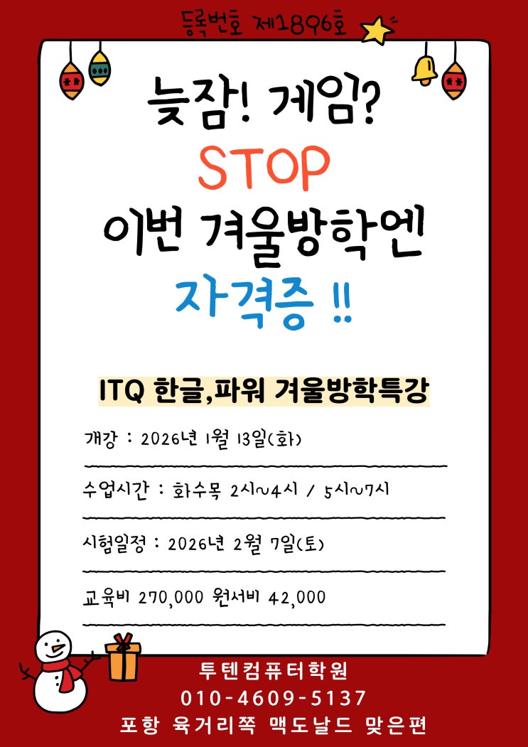 안녕하세요. 이곳은 포항 투텐컴퓨터학원입니다. 곧 겨울방학입니다. 벌써부터 밤새 게임하고, 늦잠 자는 우리 아이 모습에 걱정이 앞서지는 않으신가요? 이번 겨울방학, 학생들이 부담스럽지 않게 4주 동안 집중해서 자격증 하나를 완성할 수 있도록 겨울방학 ITQ한글,파워포인트 4주 특강 과정을 안내드립니다. 이런 학생에게 추천드립니다 방학 동안 늦잠·게임으로 생활패턴이 쉽게 무너지는 학생 수행평가/발표 과제가 걱정되는 학생 “결과가 남는 방학”을 만들고 싶은 학생 투텐컴퓨터학원의 특징 ITQ 공인강사 경력 27년 원장 직강 인강 제공 집에서도 가능한 무제한 복습 시스템 온라인 학습만으로 부족한 부분은 오프라인 첨삭....... <img src="https://blogthumb.pstatic.net/MjAyNTEyMjBfODgg/MDAxNzY2MjI2MzUzMzIx.APewME7mynD6MB5LA0GI0mw5wEe2reGPkN8OslOgCfYg.i4Ez70gTQfP-UpEg6XO2oy7nGu53y01U7CrdUK1cdPUg.JPEG/%C7%D1%C6%C4%C6%AF%B0%AD.jpg?type=s3" />
