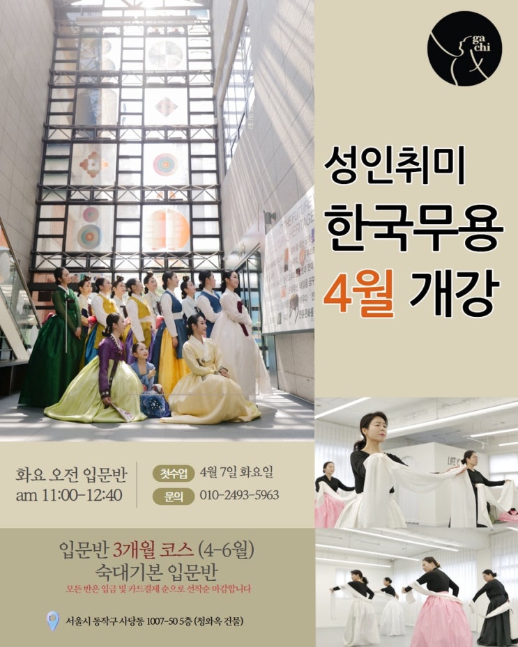 #가치무용학원 #성인입문반 4월 입문반 모집이 시작됩니다 차근차근 걸음마부터 배웁니다 완전 처음, 완전 초보도 괜찮습니다 입문자를 위해 짜인 수업으로 진행됩니다! 현재 가치무용학원 저녁반은 모두 만석이라 4월에는 오전반만 모집 진행됩니다 3개월 코스(4월-6월) 이며, 3개월 코스가 끝나면 작품반으로 올라갑니다✨ #한국무용입문 등록을 서둘러주세요 #한국무용취미 내삶의 활력소가 됩니다 [4월 신규 입문반] ✅신규 입문반 1. 화요오전 입문반 : 화요일 오전 11:00-12:40 (주1회 100분) -첫수업: 4월 7일 화요일 ‼️모든 반은 입금 및 카드결제순 선착순 마감 입니다 상담 및 문의 환영합니다 ✅등록신청 및 문....... <img src="https://blogthumb.pstatic.net/MjAyNjAzMjBfMTUx/MDAxNzczOTY3Mjc2NDU4.00I9O43ZAjnL4h6w2Q9M37Bts8NGLa34Pt2GRVrhRK0g.FCrLom7bb084IU8bVitCZafP-r4cL-nqlTuswJsNP14g.JPEG/%C1%A6%B8%F1%C0%BB_%C0%D4%B7%C2%C7%CF%BC%BC%BF%E4%A3%AD9.jpg?type=s3" />