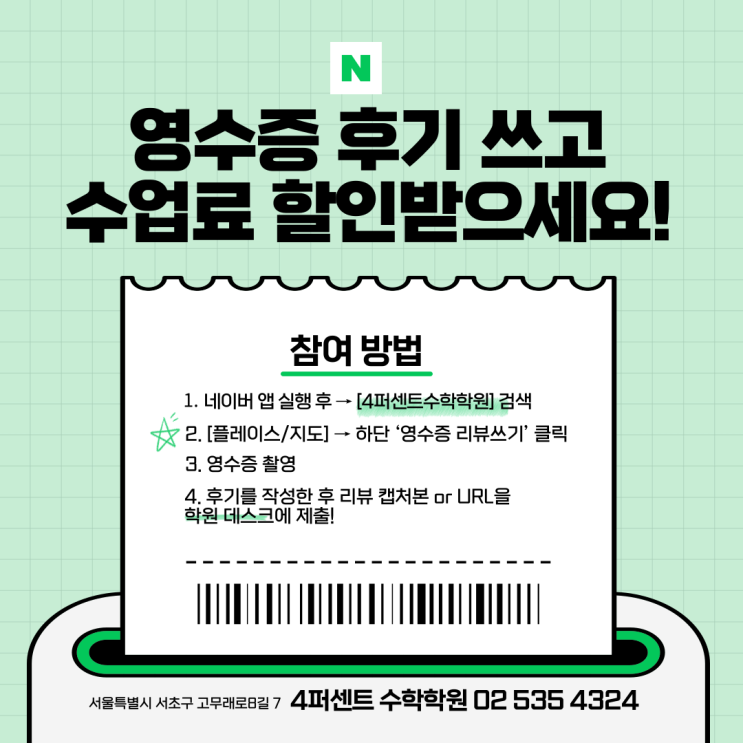 서초 반포 수학학원 4퍼센트수학 페이백 이벤트 안녕하세요! 서초 반포 수학학원 4퍼센트수학입니다 우리 학원을 믿고 선택해주신 학부모님과 학생 여러분께 감사의 마음을 담아 페이백 이벤트를 준비했어요! [EVENT] 네이버 플레이스 영수증 후기 작성 시 10,000원 수업료 할인! 참여 방법 ①네이버 앱 실행 후 → [4퍼센트수학학원] 검색 ②[플레이스] → 하단 ‘영수증 리뷰쓰기’ 클릭 ③학원 수강 후 받은 영수증으로 후기 작성 ④후기를 작성한 후 리뷰 캡처본 or URL을 학원 데스크에 제출! 리뷰 작성 꿀팁 학원 위치나 시설에 대한 만족도 선생님의 강의 스타일 수업 효과(성적 향상, 오답 관리 등) 중등 수학 내신 대비나 고등 수능 준....... <img src="https://blogthumb.pstatic.net/MjAyNTEyMTRfOSAg/MDAxNzY1Njg0NzU1NzQx.SdDIH2IKi6z3RsVP30do1zZgwVBJlA4d5Py9og_FysUg.MeQZzFT9U9TQPl5t3UnVBYEezugkgAMmyfM3e9IkRH0g.PNG/001.png?type=s3" />