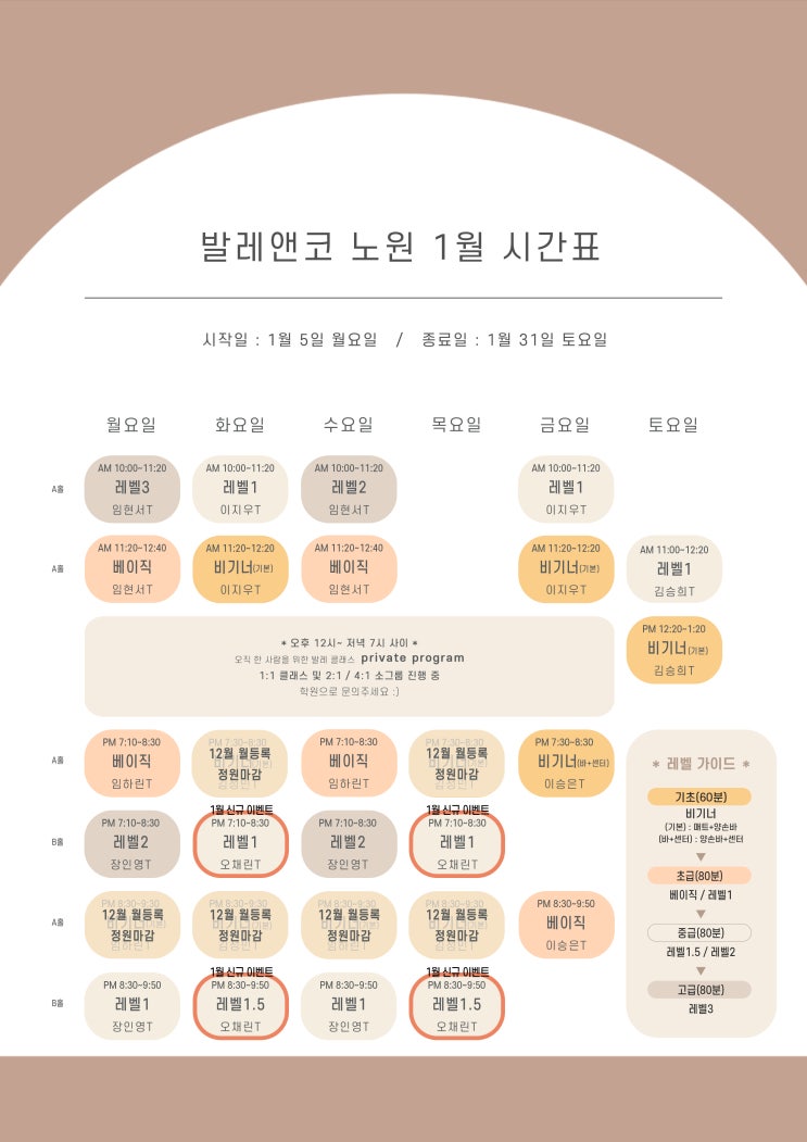 발레앤코 노원점 1월 시간표 안녕하세요, 발레앤코 노원점 1월 시간표 안내드립니다. 아래 시간표 이미지 확인 후 수강 등록 방법 혹은 난이도 등 언제든 편하게 문의 주세요. 안내드릴게요 ₊⁺⊹ 수업 문의 T : 02.533.0317 카카오톡채널 : 발레앤코 노원 1월 시간표 ✔ 비기너 신규 오픈 토요일 오후12:20~13:20 김승희 선생님 진행 ✔ 베이직 신규 오픈 월수 오전 11:20 ~ 12:40 임현서 선생님 ✔레벨1 신규 오픈 화목 오전 10시 & 화목 저녁 7시 베이직미들 수업이 레벨1으로 변경되었습니다. ✔ 마감 안내 월수 저녁 8:30 / 화목 저녁 7:30 /8:30 비기너 수업은 12월 정원 마감으로 기존회원 선등록으로 진행하여 1월 월등록 조기 마감....... <img src="https://blogthumb.pstatic.net/MjAyNTEyMTdfMTE3/MDAxNzY1OTYyMDExMzIx.rjc4S5WwltkCGoUoYUPX38l9HzB9rHKXw7kxdLJnQE0g.ha_p34ywx0XTYbnt2rwM61YqIsk_ib2mVPknLo53VJ0g.JPEG/2026_%B3%EB%BF%F8-1.jpg?type=s3" />