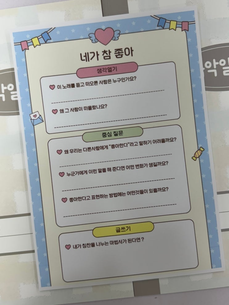 HAUM 3월 첫째주 특강 동요논술 동요를 듣고 가사를 함께 생각하며 자신의 생각과 느낌을 글로 표현해 보는 수업입니다. 노래 속 이야기와 질문을 통해 자연스럽게 생각을 확장하고, 다양한 활동으로 표현력과 사고력을 키웁니다 노래를 통해 쉽고 재미있게 시작하는 논술 수업 ️ 다양한 질문과 토론으로 생각하는 힘과 표현력 향상 ✏️ 자신의 경험과 감정을 글로 풀어보며 자기 표현력 성장 친구들의 생각을 들으며 공감 능력과 사고 확장 상상 글쓰기 활동으로 창의력과 이야기 구성 능력 향상 이번달 동요 논술의 동요는 < 네가 참 좋아 > 입니다 이 동요는 친구의 특별한 점이 아니라 그 존재 자체....... <img src="https://blogthumb.pstatic.net/MjAyNjAzMTFfMTM4/MDAxNzczMjM1OTQyODg1.C7aGCPBpEilu69UQXpQRWCcbZbKsXvRP6PtQJpUS3Bog.QXdfW0qdZPZQ5fuSYAQXrAw4sFwJM2no8VQY0NEOk9wg.JPEG/IMG%A3%DF7065.jpg?type=s3" />