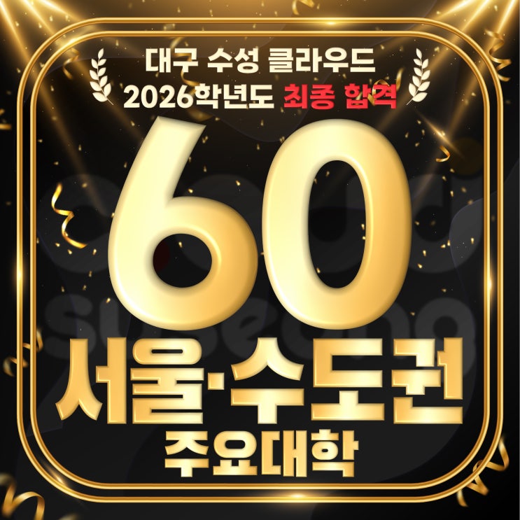 수성 클라우드 서울 & 수도권 주요대학 22026학년도 최종 합격자 안녕하세요! 대구 입시미술학원 수성 클라우드입니다 이번엔 대구·경상권 대학 최종 합격자 소식에 이어 서울·수도권 대학 최종 합격자 소식을 들고 찾아왔습니다~! 이번 26학년도에서 우리 수성 클라우드 학생들이 서울·수도권 주요 대학에서 총 60명이라는 어마어마한 숫자의 합격생들이 배출되었답니다! 그럼, 그 주인공들을 함께 만나 보실까요~?! 특히나 이번 결과에서는 서울대학교 디자인과 한국예술종합학교 2명 이라는 의미 있는 결과와 함께 국민대학교, 홍익대학교,이화여자대학교, 건국대학교 등 국내 주요 미술대학에서도 꾸준한 합격 소식....... <img src="https://blogthumb.pstatic.net/MjAyNjAzMDZfMTUz/MDAxNzcyNzc0OTg2OTEz.4NkcY4KEJ-935nuJshaqtuXv3Pp4pwfQC31dyI7MU5og.y_xuNleeXihfydZ5rRU031lFjPFs06QKjUlL-vsb8zQg.JPEG/2026_%BC%AD%BF%EF_%BC%F6%B5%B5%B1%C7_%C3%D6%C1%BE_1.jpg?type=s3" />
