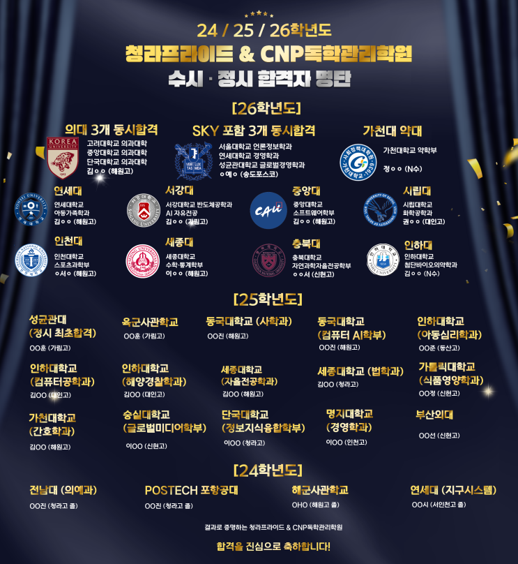 안녕하세요. 청라5단지 관리형독서실 CNP독학관리학원입니다. 오늘은 24학년도부터 26학년도까지 이어진 수시와 정시 합격 결과를 소개해 드리려고 합니다. 학생 한 명 한 명의 이름을 나열하기보다 어떤 대학과 전공으로 진학했는지 흐름 중심으로 정리해 보았습니다. CNP독학관리학원에서 만들어낸 학습 습관과 관리 시스템이 어떤 결과로 이어졌는지 함께 확인해 보시기 바랍니다. 먼저 26학년도 합격 결과입니다. 의과대학 동시 합격 사례를 포함해 서울대학교, 연세대학교, 성균관대학교 등 SKY 라인 합격 성과가 이어졌습니다. 또한 가천대학교 약학대학, 서강대학교 반도체공학과, 중앙대학교 소프트웨어 관련 학과 등 이공계와 메디컬 계....... <img src="https://blogthumb.pstatic.net/MjAyNjAyMjZfMjIx/MDAxNzcyMDg1NTIzMjc2.QMZI_ZR9MWkwX10odZXYH-EXOs6prx3iqswn-kAESxQg.TcTRCe6nks_5zg2Uvvw3NLpANYbbi31H0YiYQH3HX88g.PNG/%C1%A6%B8%F1%C0%BB_%C0%D4%B7%C2%C7%D8%C1%D6%BC%BC%BF%E4.-_%BA%B9%BB%E7%BA%BB_%281%29.png?type=s3" />