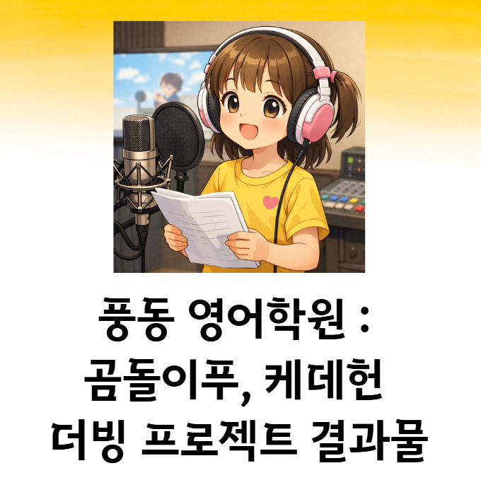 안녕하세요? 풍동 영어학원, 라임 어학원입니다. 오늘은 오랜만에 우리 친구들의 더빙 프로젝트 결과물을 공유해 드리게 되었습니다. 이번 프로젝트에는 총 아홉 명의 친구들이 참가했습니다. 세 친구들은 < 곰돌이 푸 > 더빙을 진행했고, 다른 여섯 친구들은 < 케이팝 데몬 헌터스 > 더빙을 진행했습니다. 이번 더빙은 반별로 진행한 것이 아니라, 참여를 원하는 학생에 한해 진행했기 때문에 전적으로 수업 외적인 시간에 연습을 진행해야 했는데요, 모두 열의를 가지고 참여해 주어서 정말 기특했습니다. (^ ___ ^) 추가 숙제도 전혀 마다하지 않더라고요! 더빙 넘 재미있다고 걸어다니면서도 맨날 대사를 읊조리던 친구도 있었어....... <img src="https://blogthumb.pstatic.net/MjAyNjAzMDRfNDcg/MDAxNzcyNjE1OTU3MTIy.cHG7erO-MNThasAGXwRt4_KQ59EA-aNEHtjNYr4Dib0g.w0-uc9J1gqOPotpQ0TSKSqOmGWAV-W1GjOxCr8a3TeUg.PNG/image.png?type=s3" />
