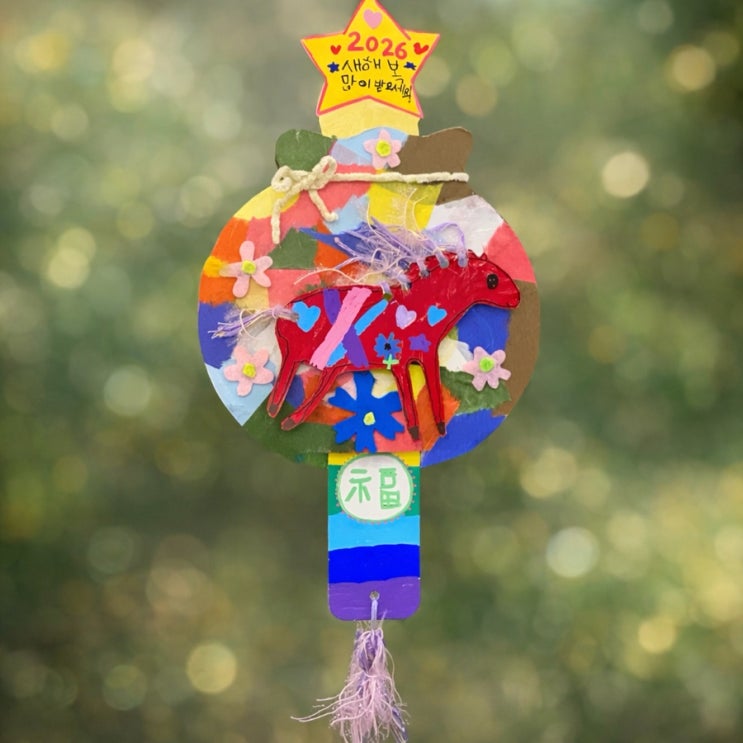 2026년, 역동적인 말의 해를 맞아 플립업 (flip-up) 복주머니를 만들어 보았어요! 무언가 뿅!!! 하고 나타나는 반전 가득한 요소를 좋아하는 우리 아이들을 위한 맞춤 수업! 어디서 카드가 튀어나오냐며 벌써부터 기대가 가득한 질문이 이어졌어요 메인이 되는 복주머니부터 만들어야겠죠~? 형태만 보아도 복이 한가득 들어올 것 같은 빵빵한 복주머니를 만들어보아요 가위로 두꺼운 보드지 자르기~! 자연스럽게 손 힘이 들어가요 ㅎㅎ 두꺼워서 오리기 어려운데도 천천히 해 나가는 모습이 꽤 진지하죠~? ✂️ 가위질 연습은 할 수 있다면 스스로 하게 하고 있어요. 단순히 만들기 활동을 위해서만이 아니라 손의 소근육 발달은 물....... <img src="https://blogthumb.pstatic.net/MjAyNjAzMDVfMjQ2/MDAxNzcyNjkwMTMxNzM3.Jur2mS75BeqGYNanBFADUERGRf3LKm5L4gxznRZGohwg.CRbOmyEGDr1Zrqh_Vnea8DtoKKd1LoTPb8WwwSI6z7Ig.JPEG/C0D3083A%A3%AD0452%A3%AD48D7%A3%ADBBF1%A3%ADC9A13F808986.jpg?type=s3" />