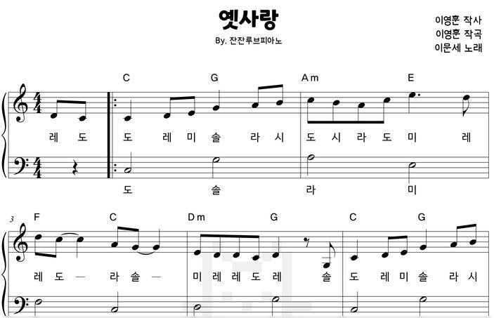 이문세 '옛사랑' 쉬운 피아노 악보 3종 모음 (계이름O) 안녕하세요, 시흥 월곶 성인피아노학원 블루밍피아노입니다 :) (위 영상은 본문과 관계 없는 본원의 자료입니다. 수강생 분의 동의 하에 업로드되는 영상이며, 뒷모습 촬영 동의시 수강료 할인이 적용됩니다.) 안녕하세요^^ 어제 무슨 일인지 제가 머무는 곳은 3월에 함박눈이 내렸습니다. 지금 잠시 해외에 머물고 있는데요, 한겨울에도 눈이 잘 오지 않는 곳에 3월에 눈이라니요. 이른 아침, 쏟아지는 눈을 보고 있자니 문득 이 노래가 생각이 나더라구요. 이문세의 '옛사랑' 쉬운 피아노 악보입니다. 줄곧 저희 원에는 중장년~시니어 분들의 수강비율이 그간 많아왔....... <img src="https://blogthumb.pstatic.net/MjAyNjAzMTFfMTAw/MDAxNzczMjE0OTgwODk5.fd4otxGxsjhXdeC7g0eeUIO1kYW-zO-UP5YX3ulp7wkg.cqfylRoMK5D2qm7J9F-lL-m8Yh8CUAVEa1XBSurKGmcg.JPEG/%C0%CC%B9%AE%BC%BC_-_%C0%DC%C0%DC%B7%E7%BA%EA.jpg?type=s3" />