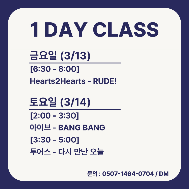 ️ 3월 둘째 주 원데이 수업 안내 안녕하세요, 아지트 뮤직댄스 학원 봉선점입니다 :) 3월을 맞이하여 학원 수업 일정 안내드립니다. 3월 둘째 주에는 특별 원데이 수업이 진행됩니다! 하루 동안 부담 없이 참여하실 수 있는 원데이 클래스로, 새로운 에너지로 한 달을 시작하고 싶은 분들께 추천드려요 ✨ 또한, 3월 둘째 주 정규 수업은 모두 정상적으로 진행되오니 기존 수강생분들께서는 평소와 동일하게 수업 참여해 주시면 됩니다. 바쁜 일상 속에서도 항상 저희 학원에 관심 가져주시고 찾아주셔서 진심으로 감사드립니다. 원데이 수업을 통해 새로운 에너지를 채우고, 정규 수업에서는 더욱 즐겁고 집중도 높은 시간으로 함께해....... <img src="https://blogthumb.pstatic.net/MjAyNjAzMTFfMTMz/MDAxNzczMTk0MjcxMDc5.9Cj4Fc4i-xrm9KUZC_wB9HocIsy-VzP4GNxxgvKPQj0g.V0WB1fRY5sZDMwmGyjBo09wD-ztOdwreAIm3bKH6lMog.PNG/001.png?type=s3" />