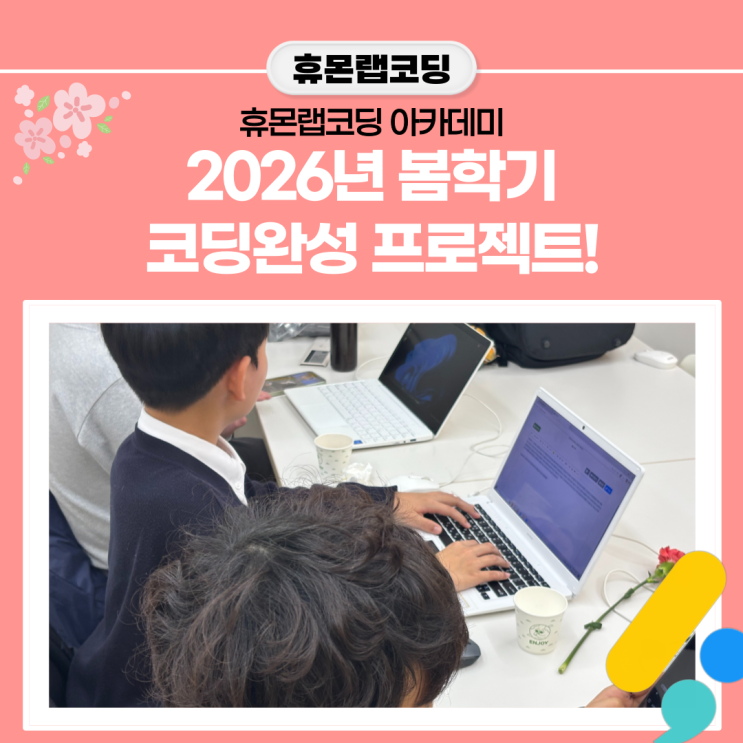 안녕하세요! 스스로 생각하는 힘을 키우는 휴몬랩코딩 아카데미 입니다. 어느덧 겨울 시즌이 마무리되고, 본격적인 봄 시즌이 찾아왔습니다. 새 학기를 맞이하여 학생들에게 새로운 경험을 해볼 수 있도록 휴몬랩코딩 아카데미에서 봄시즌 코딩완성 프로젝트를 진행합니다. 봄시즌 코딩완성 프로젝트 봄시즌은 다른 시기에 비해 많은 비교과대회가 개최할 뿐만 아니라 새로운 학기 시작으로 코딩을 꼭 배워두면 좋은 시기이기도 합니다. 휴몬랩코딩 아카데미에서 다음과 같은 코딩반 개강 뿐만 아니라 설명회 등 진행 중이니 많은 관심 부탁드립니다! 고등학교 1,2학년 대비반 모집 정보 내신 대비 및 수행평가 완벽대비 수업 COS·COS PRO 자격증....... <img src="https://blogthumb.pstatic.net/MjAyNjAzMTNfMTk0/MDAxNzczMzc3ODgzOTc5.n0o0En49h_5yVNGwNQZTNdm54VbXBY6QFluuhJb-uJIg.twLe36VrcK0F24LxaeQvyUc6k3yyRgP9kNFK4Kg4Qqsg.PNG/%BA%ED%B7%CE%B1%D7.png?type=s3" />