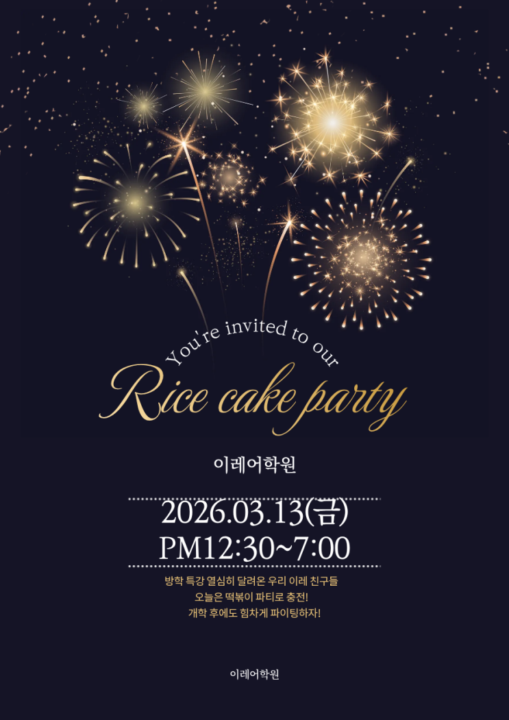✨ 이레어학원 떡볶이 파티 이야기 ✨ 방학 동안 열심히 달려온 우리 이레 친구들을 위해 작은 파티를 준비했습니다. 개학하고 학교 적응하느라 조금은 지치고 힘들었을 아이들에게 잠깐의 즐거운 쉼과 웃음을 선물하고 싶었어요. 그래서 준비한 떡볶이 파티! ️ 떡볶이와 간식, 그리고 아이들의 웃음소리로 학원 안이 작은 축제처럼 반짝반짝 빛나는 시간이었습니다. ✨ 아이들이 “선생님 너무 맛있어요!” “오늘 진짜 행복해요!” 하며 웃는 모습을 보니 오히려 제가 더 큰 선물을 받은 느낌이었습니다. ❤️ 공부도 중요하지만 아이들에게는 행복한 기억도 참 중요하다고 생각합니다. 이레어학원은 아이들이 공부만 하는 곳이....... <img src="https://blogthumb.pstatic.net/MjAyNjAzMTRfMTg5/MDAxNzczNDU0Mzg0ODc0.Ufpmw4hte2ZdyH4khA5iRPAp-m_dqI7anJGwCFv5a2Ug.lzLnh_BOqLiAvUih8LNBtkLBxOy5U6pvx88TzTAmwV8g.PNG/%C1%A6%B8%F1%C0%BB%A3%DF%C0%D4%B7%C2%C7%D8%C1%D6%BC%BC%BF%E4.%A3%A86%A3%A9.png?type=s3" />