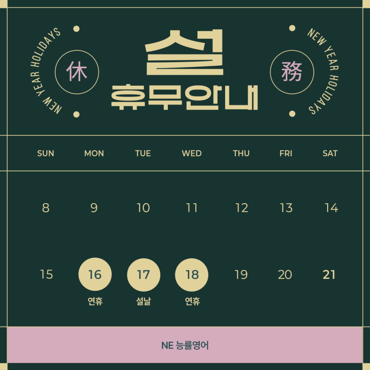 안녕하세요. NE 능률영어입니다! 2월 16일(월), 17일(화), 18일(수)는 설 연휴로 학원 휴무입니다. 등원에 착오 없으시길 바라며, 설 명절 가족과 함께 평안하고 따뜻한 시간 보내시길 바랍니다. <img src="https://blogthumb.pstatic.net/MjAyNjAyMTNfOSAg/MDAxNzcwOTcwOTUwNDc0.0V1G-ByvqJnQsjVfgob13rKz8V48hWBNM6YPbrURabgg.-SgaWgZ-KjN7iVubbNiq_46Q-11r4AbklY5aCTynM9wg.PNG/%C1%A6%B8%F1%C0%BB_%C0%D4%B7%C2%C7%CF%BC%BC%BF%E4_%2812%29.png?type=s3" />