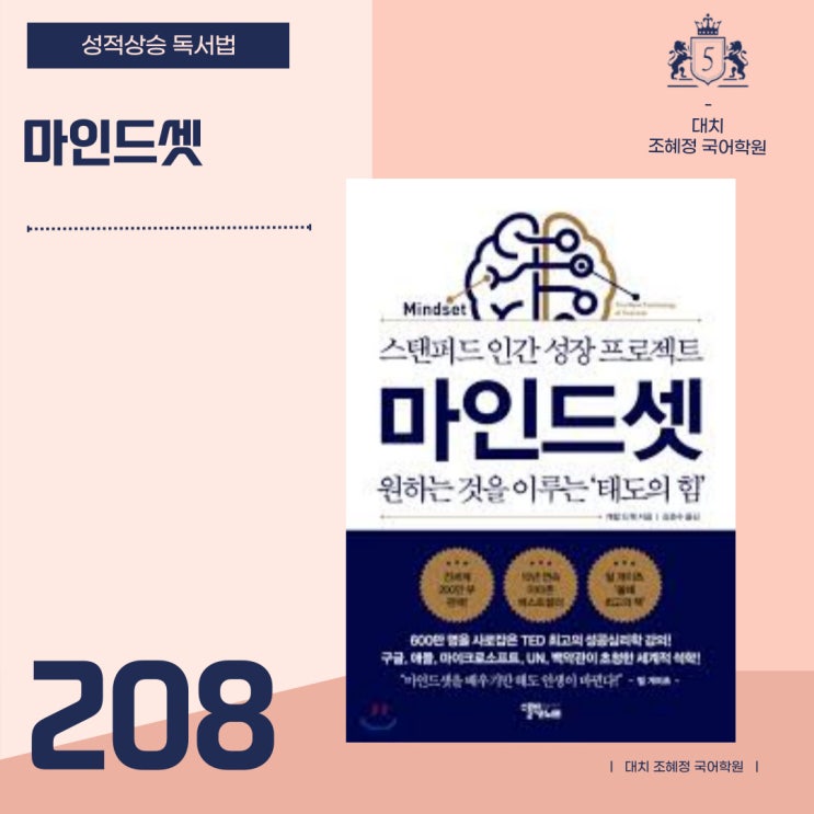 안녕하세요! 대치 조혜정 국어쌤입니다 1. 핵심 개념: 당신은 어떤 마음가짐을 갖고 있나요? 이 책은 인간의 마인드셋을 두 가지로 명쾌하게 나눕니다. 고정 마인드셋 "사람의 지능과 재능은 태어날 때 정해져 있어."라고 믿는 태도입니다. 이들은 자신의 능력을 증명하는 데 급급하며, 실패하면 "난 역시 안 돼"라며 쉽게 포기합니다. 타인의 비판을 공격으로 받아들이죠. 성장 마인드셋 "능력은 근육처럼 쓰면 쓸수록 발달해."라고 믿는 태도입니다. 이들에게 실패는 '부족함의 증거'가 아니라 '성장을 위한 데이터'입니다. 더 어려운 도전을 즐기고 그 과정에서 도파민을 얻습니다. 2. &qu....... <img src="https://blogthumb.pstatic.net/MjAyNjAyMTlfMjYx/MDAxNzcxNDYzNDk0NDIx.cOHqAVqm-HUZU2Z9Gl10bP-OLBoNJywWB5esTguqLH0g.VeYE4OEB053B1i9M1MyUcvf5A2lGWD5Q1H2pw29MX4Qg.JPEG/%C1%A6%B8%F1%C0%BB-%C0%D4%B7%C2%C7%D8%C1%D6%BC%BC%BF%E4_-026.jpg?type=s3" />