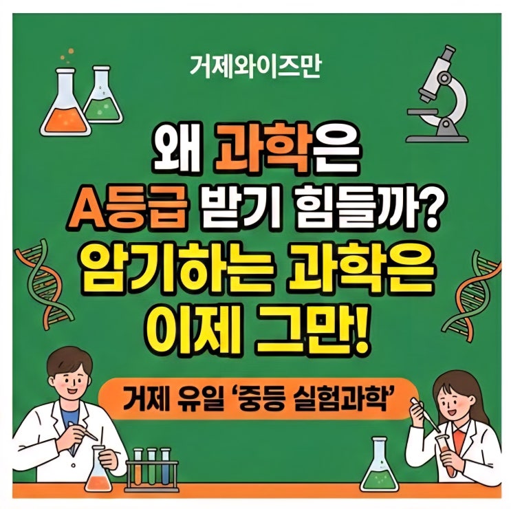 학업 난도가 급격히 높아지는 중등 시기, 학부모님들 사이에서 가장 의외의 복병으로 꼽히는 과목이 무엇인지 아시나요? 바로 '과학'입니다. 중학교 진학 후 내신 A등급을 받기 가장 어려운 과목 1위로 과학이 꼽히는 이유, 그리고 거제와이즈만이 그 해결책을 어떻게 제시하는지 블로그 포스팅 글로 정리해 드립니다. [거제와이즈만] 중등 내신 A등급의 복병 '과학', 암기인가요? 아니면 경험인가요? 안녕하세요, 거제 지역의 과학·수학 영재 교육을 책임지는 거제와이즈만입니다. 초등학교 때까지는 곧잘 하던 아이가 중학교 첫 시험에서 과학 점수를 받고 당황하는 경우가 많습니다. 통계에 따르면 중학교 내신에서 A등급....... <img src="https://blogthumb.pstatic.net/MjAyNjAyMjhfMTc5/MDAxNzcyMjQxOTk1Njg3._NVWNIkWlTJ8-5sGBxN_siQ4xAABVtlUvpTv-9ywh7Mg.aPMBdKtie9_Jpzu59AJVsO3OlPvAb6-skQr7G2X4-2og.JPEG/KakaoTalk_20260228_102602209.jpg?type=s3" />