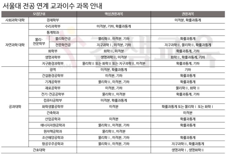 서울대 전공 연계 교과이수 과목 (출처=서울특별시교육청교육연구정보원'쎈진학<대입전형이해와대비>') 서울대는 2026학년도부터 모집단위별 전공 연계 교과이수 과목을 구체적으로 안내하고 있음. 각 단과대학과 학과 특성에 따라 핵심권장과목과 권장과목이 다르게 제시되며, 자연과학·공과·의약계열은 미적분, 확률과통계, 기하, 물리학Ⅱ, 화학Ⅱ, 생명과학Ⅱ 등의 이수가 중요하게 강조됨. 사범대와 사회과학대 역시 전공 특성에 맞는 수학·과학 교과 이수를 요구. 단순 내신 성적뿐 아니라 지원 전공과의 교과 적합성이 중요해진 만큼, 희망 학과에 맞춘 전략적인 과목 선택이 필요. <img src="https://blogthumb.pstatic.net/MjAyNjAyMjNfMTQ3/MDAxNzcxODEyMDQ5Nzc1.MmKqiaGOinM6KsVLqz6eX8k5vlAo5xbm_lFBnunTEkcg.g8JieFjJ1Wz4SqboEV9Df2oZGY-ci818vBChh4n4GsQg.JPEG/1.jpg?type=s3" />