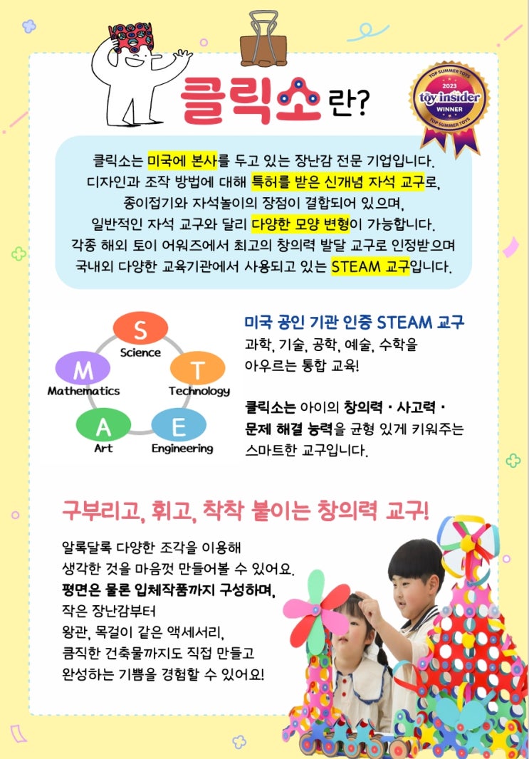 안녕하세요. 알파시티 사고력수학전문 아이셈수학입니다. 요즘 유치부 수업문의가 아주 많은데요~ 아이들 수업에 접목시킬 만한 것들을 찾다가.. 새로운 교구를 체험하고 지도사과정을 수료하고 왔습니다. 미래인재양성을 위한 창의융합적 사고력을 키울 수 있는 클릭소 클릭소의 이름들은 모양에 따라 다르구요, 각 자석 모양들은 접었다펼치면서 다양한 모양으로 만들 수 있었습니다. 4시간이 어떻게 가는지도 모르고 열심히 따라서 만들고 배웠답니다. 생각하는 힘을 키우는 열린 결말의 장난감 교육해주시는 강사님께서 몬테소리 나 다른 수학교구 들은 그 정답을 맞추는 목표가 있지만 클릭소는 결과가 표현하는 아이마다 다른 열린 장난감....... <img src="https://blogthumb.pstatic.net/MjAyNjAyMjNfMTgw/MDAxNzcxODE1NzA3NTgz.eYCvUqULil3tbfw9FpTLKwJRWXCRfS3FZFMg_hobw_gg.AWP-6UL7zv5Dq5cVi8YgfVpPAXYtedhgxlE6FKgjGkAg.JPEG/%BD%BA%C5%A9%B8%B0%BC%A6_23-2-2026_115718_.jpeg?type=s3" />