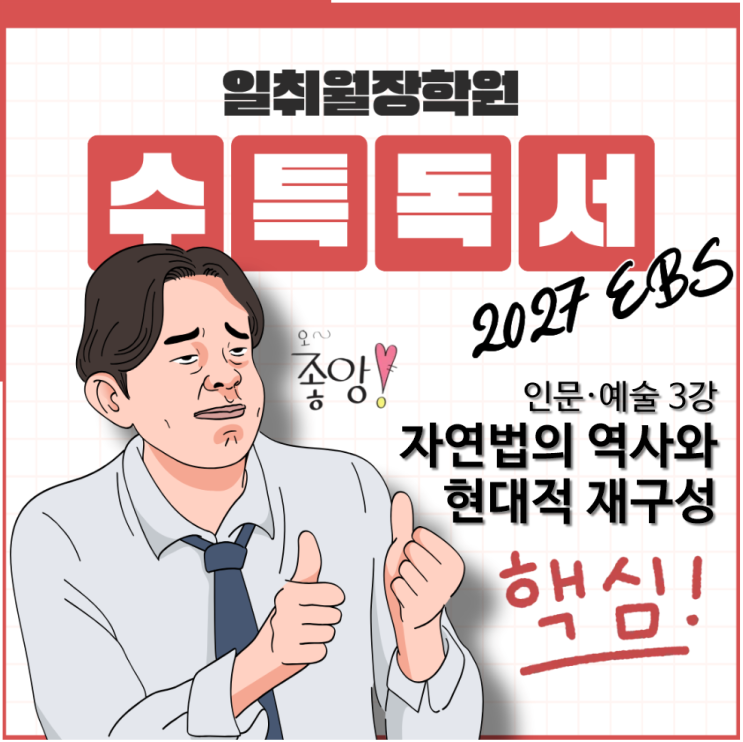 2027학년도 수능 대비 EBS 수능특강 독서 분석 인문·예술 3강 / 자연법의 역사와 현대적 재구성 법은 사회 구성원 간의 갈등을 조정하고 질서를 유지하기 위한 제도적 장치로서, 주로 국가에 의해 제정되고 시행되는 ⓐ실정법을 중심으로 구성된다. 실정법은 입법 기관이 사회의 구체적 상황에 맞추어 만든 규범으로, 강제력과 명확한 절차를 통해 사회 질서를 실현한다. 그러나 실정법만으로는 인간 사회의 근본적 정의와 도덕적 정당성을 충분히 설명하기 어렵다. 이러한 한계를 보완하는 개념이 바로 인간의 본성과 이성에 근거한 보편적 규범인 ‘자연법’이다. (후략) ‣ 해제 : 이 글은 자연법 개념을 중심으로 법의 본질과 정당성에 대한....... <img src="https://blogthumb.pstatic.net/MjAyNjAzMThfODEg/MDAxNzczODE4NzYxMzU2.yZM1QSiyMxsJubL1uqeBLvarpKE3HClRArwIrAqTY90g.NDeT8eYxBy9ms6c-Urlbp940zZNsW59kcnSEq36ZQLcg.PNG/1.png?type=s3" />