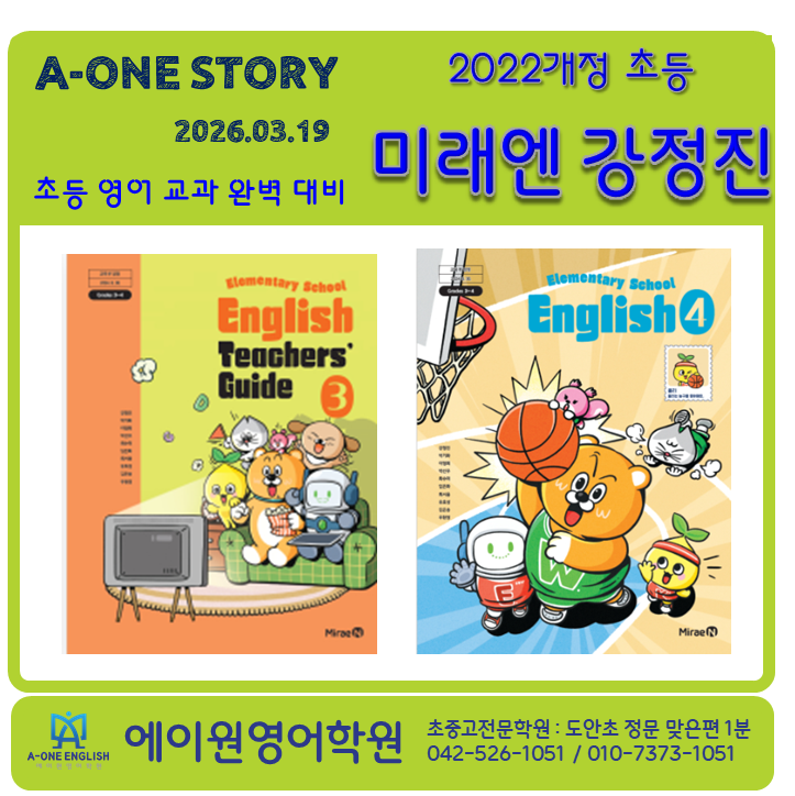 https://www.mirae-n.com/cl/mn-cl-1-01.frm?linkServiceCd=CL0000SC&educationlevelcode=01¤tPageNo=1 초등 영어는 시작하는 방법에 따라 결과가 완전히 달라집니다. “얼마나 많이 아느냐”보다 “얼마나 자연스럽게 사용할 수 있느냐”가 더 중요합니다. 또한 아이들이 부담 없이 즐기며 영어를 친숙하게 받아들이는 과정이 무엇보다 중요합니다. 에이원 영어학원은 2022 개정 교육과정을 기반으로, 초등 영어의 핵심 구조를 반영한 ✔ Reading · Writing · Speaking · Listening · Grammar ✔ 5대 영역 통합 학습 ✔ 단계별 확장 커리큘럼 을 중심으로 이해 → 표현 → 활용으로 이어지는 영어 학습 시스....... <img src="https://blogthumb.pstatic.net/MjAyNjAzMTlfMTEw/MDAxNzczODY2ODE1MDEx.BJaylKPQNhi6qxhAFZG6dGBetGmEHKk5Qx06FKD_jogg.9rwJVxiPjGZdYA_E44kBR8-KJodFrARUGnfQFIprg1wg.PNG/image.png?type=s3" />