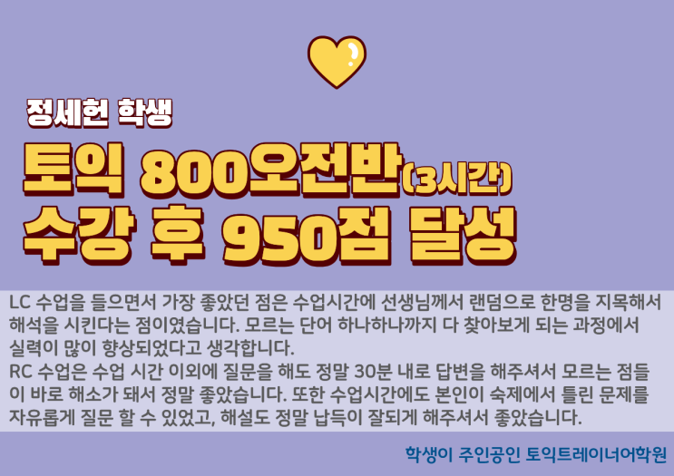 오늘은 토익트레이너에서 단어 테스트와 세세한 풀이방법을 통해 목표점수에 도달한 정세헌 학생의 후기를 알아보아요~! 1. 800반 LC 후기 LC 수업을 들으면서 가장 좋았던 점은 수업시간에 선생님께서 랜덤으로 한명을 지목해서 해석을 시킨다는 점이였습니다. 압박감이 살짝 있다보니까 모르는 단어 하나하나까지 다 찾아보게 되는 과정에서 실력이 많이 향상되었다고 생각합니다. 2. 800반 RC 후기 RC 수업을 들으면서 가장 좋았던 점은 질문을 수업외에도 할 수 있다는 것이였습니다. 수업 시간 이외에 질문을 해도 정말 30분 내로 답변을 해주셔서 모르는 점들이 바로 해소가 돼서 정말 좋았습니다. 또한 수업시간에도 본인이 숙제에서 틀린....... <img src="https://blogthumb.pstatic.net/MjAyNjAyMjVfMjU4/MDAxNzcyMDE2MzU4OTE2.OW_lj3SXI-7gkGQHz5I_aFUciiA4_DSp18O6EIecOQAg.mqSYEXnV_kxu-8mB-J52q5JDJlgDVi7psXsNo4M0LlIg.PNG/%C1%A4%BC%BC%C7%E5.png?type=s3" />