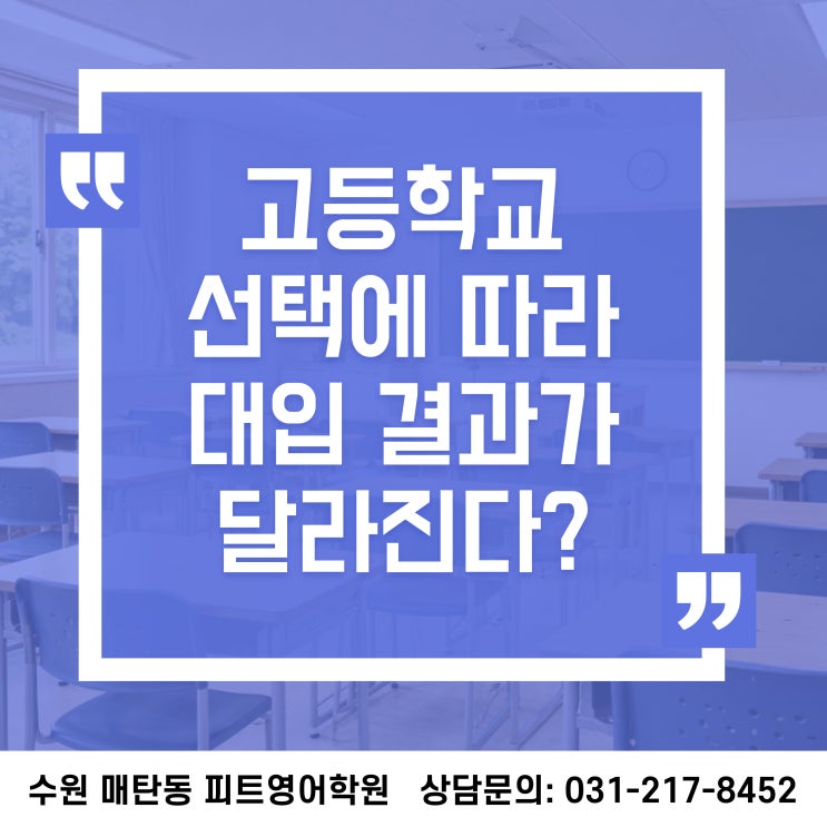 안녕하세요 문법부터 스피킹까지 꼭 맞게 FIT 해주는 망포 매탄동 피트영어학원 입니다 :) 중학교 3학년이 되면 학생과 학부모가 가장 많이 고민하는 주제가 바로 고등학교의 선택입니다. 자사고, 외고, 국제고, 일반고 중 어떤 학교를 선택하느냐에 따라 대입 결과가 달라질 것이라는 기대와 고민이 동시에 생기기 때문입니다. 그래서 오늘은 고등학교 선택에 따라 정말로 대입 결과가 달라질 수 있는지 함께 알아보도록 하겠습니다. 고등학교 유형별 특징 특목·자사고는 일반적으로 특화된 교육과정이 장점으로 꼽힙니다. 외고는 영어·중국어·일본어 등 외국어 중심의 심화 교육을 제공하며, 국제고는 국제 이해와 사회과학 중심의 커리큘럼을....... <img src="https://blogthumb.pstatic.net/MjAyNjAzMTJfMjc1/MDAxNzczMjg5NTM2MjQw.eEHzxTV_tmi7Tc6UtsU7IIRsWwwBaxV7YpQettNtYgYg.FWnv2NzbcFPuuVG7-ySY2u8YTTnHOBkqbaUQ2W5O2L4g.JPEG/%C7%C7%C6%AE%BF%B5%BE%EE%C7%D0%BF%F8-001.jpg?type=s3" />
