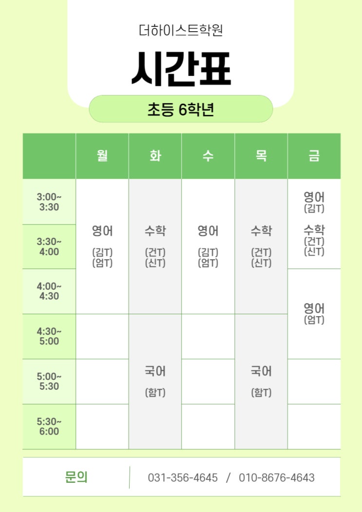 이외에도 신설반 영어 화목금 (3~4:30) - 원장T, 엄T 수학 월수금 (3~4:30) - 설T, 신T 순차적 개강예정입니다. 레테 -> 상담 -> 반배정 -> 담임책임제 -> 주기적 학습테스트 및 상담 -> 레벨업 이 과정으로 중등을 대비하는 체계적 수업이 이루어집니다! ☆영어 수업구성☆ 어휘, 문법(기본기반부터 응용심화반까지), 독해, 듣기 및 서술형/수행평가대비 쓰기수업 ☆수학 수업구성☆ 과정별, 레벨별 수업 기본기반- 이해하기 쉬운 개념설명과 스스로 풀게 하는 문제풀이/ 반복학습->응용문제 도약 응용심화반- 수학 개념간의 유기적 관계 파악, 응용심화 최상위 문제풀이 -> 경시대회 준비 ☆국어 수업구성☆ 문해력 다지....... <img src="https://blogthumb.pstatic.net/MjAyNjAzMTdfMjc3/MDAxNzczNzQyNjA1MTc4.aRKTvYm_iG6suH7jNJAdUvl2dd2SYk4FilUBieIN0tgg.sxelVwo1woFkRu4BZFndadzNXBHUijT5XpukcecUUEIg.JPEG/1773742519073.jpg?type=s3" />