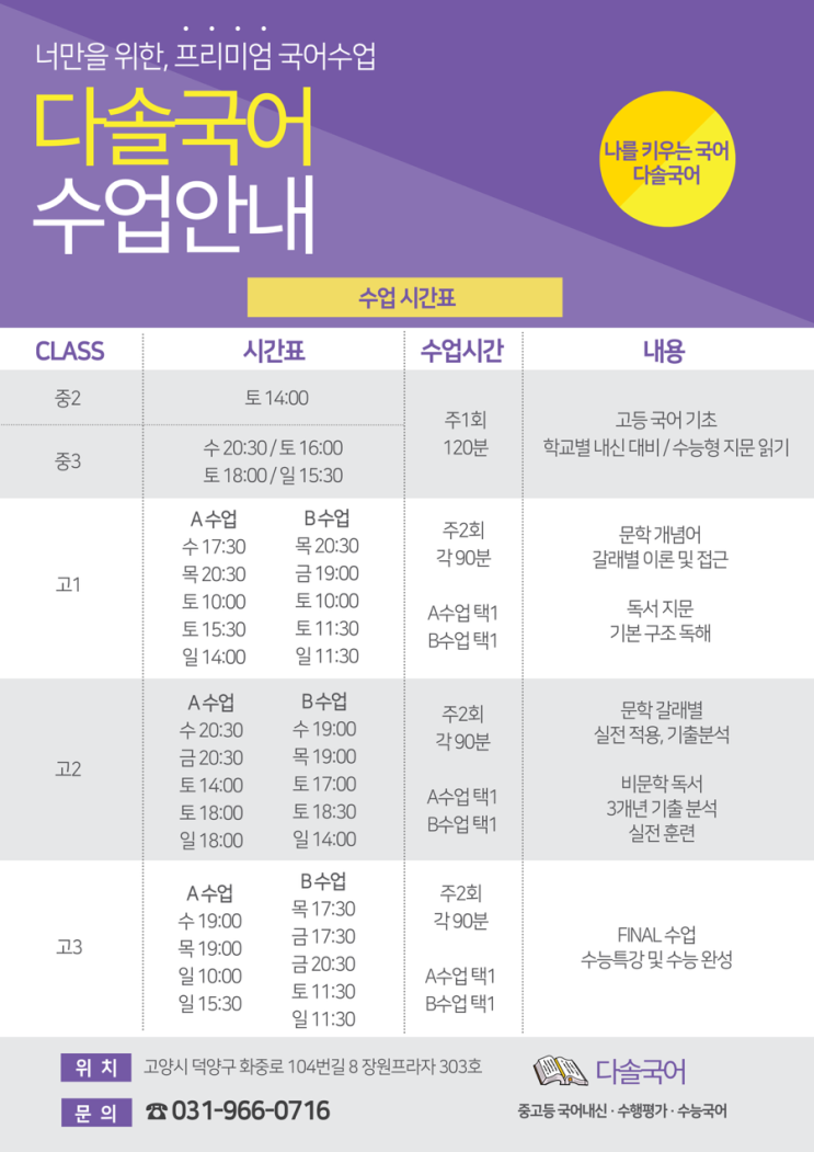 2026년 다솔국어 정규 수업 시간표 안내 | 일산 화정 국어학원