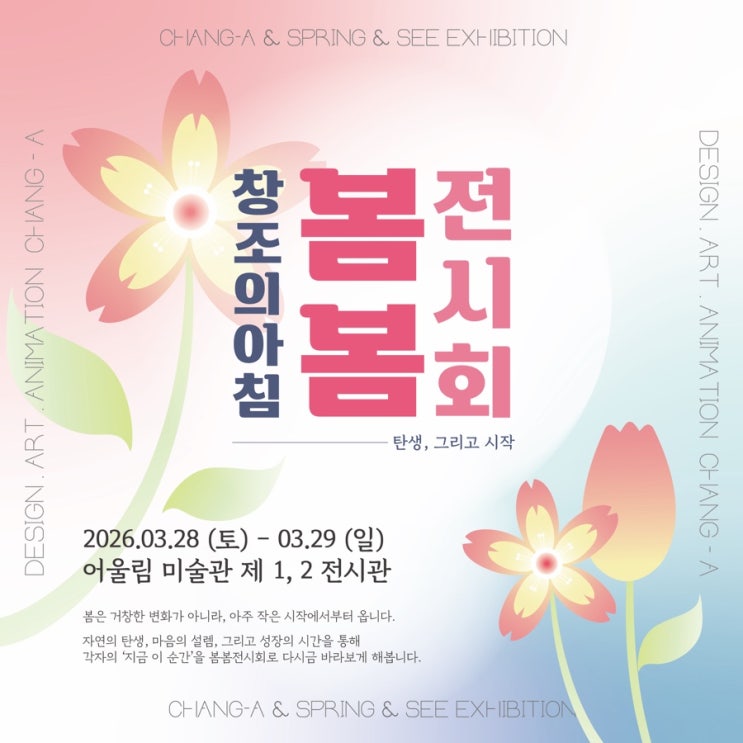 행신 창조의아침 봄 전시회 “탄생, 그리고 시작” 안녕하세요, 행신 창조의아침 미술학원입니다 :) 따뜻한 봄과 함께 학생들의 새로운 시작을 담은 전시회가 열립니다. 이번 전시는 단순한 결과물이 아닌, 작은 시작에서부터 쌓아온 과정과 각자의 시선으로 표현한 ‘지금 이 순간’을 담아낸 자리입니다. ⸻ 전시 일정 안내 • 일정 : 2026.03.28 (토) ~ 03.29 (일) • 시간 : 오전 10시 ~ 오후 6시 • 장소 : 어울림 미술관 제 1, 2 전시관 ⸻ 행사 프로그램 ✔ 오프닝 행사 • 3월 28일 (토) 오후 1시 30분 ✔ 경품 추첨 이벤트 • 3월 28일 (토) 오후 2시 • 1등 : 배달의민족 10만원권 • 2등 : 애슐리 5만원권 • 3등....... <img src="https://blogthumb.pstatic.net/MjAyNjAzMjBfOTMg/MDAxNzczOTk5NDQ1NDEy.tFd5YZTbxH2ug_4oiGA5U7MF90Gu7aVly1QPL34z0p0g.HGGkyTCqqnG2iP73tkuwrFa_MOGyfyYBeCHSqVQIa3kg.JPEG/IMG%A3%DF2960.JPG?type=s3" />
