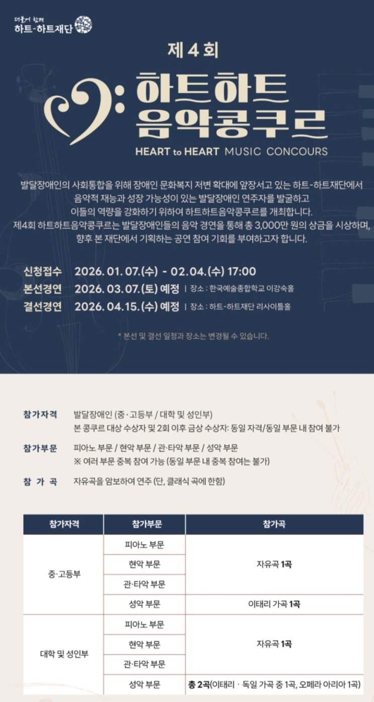 하트하트 콩쿨이 무엇일지 궁금하실 것 같습니다 하트하트 음악 콩쿨은 발달장애인들을 위한 콩쿨입니다 하트하트 재단이라는 곳에서 발달장애인 오케스트라도 있고 발달장애인의 음악활동을 통해 성장을 독려하고 문화활동을 할 수 있도록 여러 활동을 하는 것 같습니다 이곳에 간 이유는 저의 오랜 제자가 본선에 진출하게 되었기 때문입니다 ^^ 음악을 좋아하고 즐기는 이친구는 초1때부터 올해 증2가 되는 지금까지 주1회 수업을 거의 빠지지 않고 꾸준히 받아온 친구예요~ 음악을 좋아하지만 이것을 배움으로 연결하기까지는 오랜 시간이 걸리긴 했습니다 일단은 음악적인 감각을 깨우는 과정부터 시작이였습니다 이 친구는 음감 리듬감 기....... <img src="https://blogthumb.pstatic.net/MjAyNjAzMDlfMjgy/MDAxNzcyOTg1NzkyNDM1.iIBwhmOuvLGdM-u3UaJ061BYy4cqYbD9qAaGDnR7S3cg.B34Bftqmz4KT_ekLOAU2v_1lgd9dpo10udQfF5EEkbMg.JPEG/900%A3%DFScreenshot%A3%DF20260308%A3%DF080922%A3%DFNAVER.jpg?type=s3" />