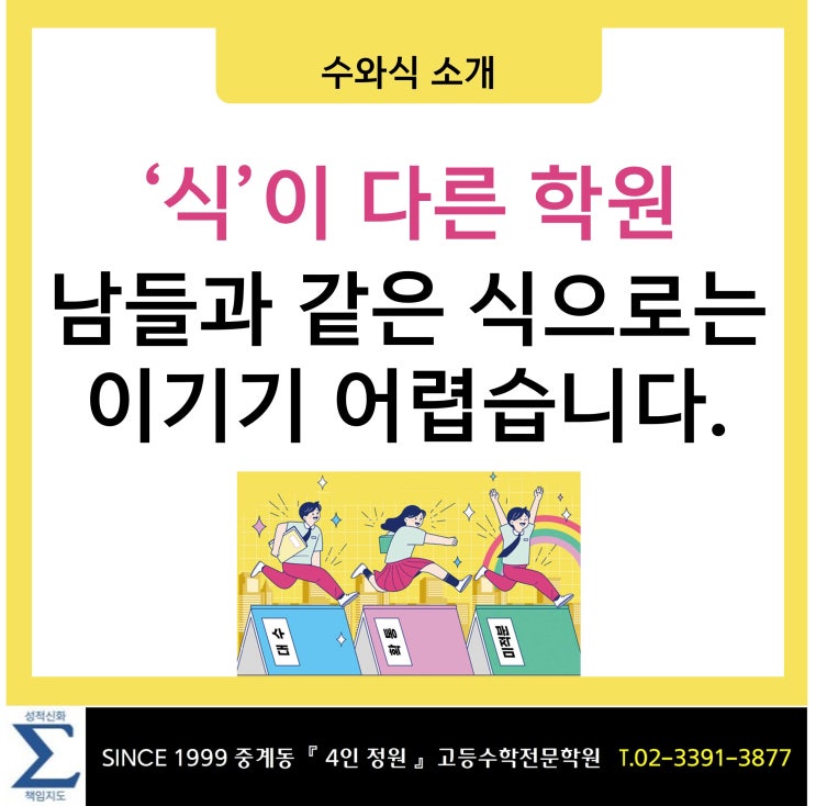 수학에 있어서 "식"의 중요성은 두말할 필요가 없습니다. 그래서 우리 학원 이름도 "수와식"입니다. 수학문제 풀이법을 보다보면 정말 감탄스런 식들이 있습니다. 해설지에 나온 대로 풀다보면 시간이 부족할 수밖에 없습니다. " 아름다운 식쓰기 " 수와식학원 베테랑 선생님들께 배워보세요~ 수학은 미리 미리 은행사거리 수와식학원에서 준비하세요~ https://blog.naver.com/suwasicblog/224133996826 >> 수와식학원 레벨테스트 신청 바로가기 << 입시에 대해 궁금한 사항은 언제든지 27년 전통명문 중계동 수학학원 전문입시컨설팅 수와식학원 입시전략연구소에 문의하시기 바랍니다. 상담문의 전....... <img src="https://blogthumb.pstatic.net/MjAyNjAzMDZfMjk4/MDAxNzcyNzk2MTAyNDU0.ukxtIbSG0SB5zi7ZNFrWvlllMPaS2sudjdpgChz4LRgg.o6GeI_BhNpmrzRbny9AKHR7JkGuOmuPrLVbesPavmkYg.JPEG/%BD%C41.jpg?type=s3" />