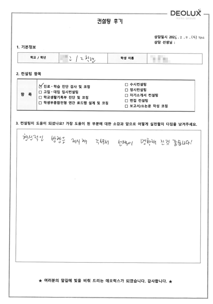 입학사정관 & EBS 진학상담위원 출신 학생부종합전형 컨설팅 전문 대치동 데오럭스 입시컨설팅입니다. 대치동 데오럭스 입시컨설팅 안녕하세요 학생부종합전형 컨설팅 전문 대치동 데오럭스 입시컨설팅입니다. 예비 고3이 되는 시점은 단순히 학년이 올라가는 것이 아니라 그동안 쌓아온 활동을 점검하고 "이제는 정리할 것과 남길 것을 구분해야 하는 시기" 이기도 합니다. 특히 탐구를 성실히 해온 학생일수록 오히려 활동이 넓게 퍼져 보이지는 않는지, 전공과 직업 방향이 선명하게 보이는지에 대한 고민을 많이 하게 되는데요. 오늘은 이러한 고민을 안고 상담을 진행한 부산 소재 고등학교 예비 고3 학생의 컨설팅....... <img src="https://blogthumb.pstatic.net/MjAyNjAyMTFfMTQ0/MDAxNzcwNzkwNzcyMzIy.HbnY-I1OTgVRfgXC3ifn7J1kmLSp51wGZ86xjloZ390g.PEoNcJaB_l34MOXKlPxMTdYgI2ukG7oYsqC8D3BncNYg.PNG/2026.02.11.11%BD%C3_%C7%D0%BA%CE%B8%F0_%C8%C4%B1%E2_%B5%A5%BF%C0%B7%B0%BD%BA_%C0%D4%BD%C3%C4%C1%BC%B3%C6%C3_.png?type=s3" />