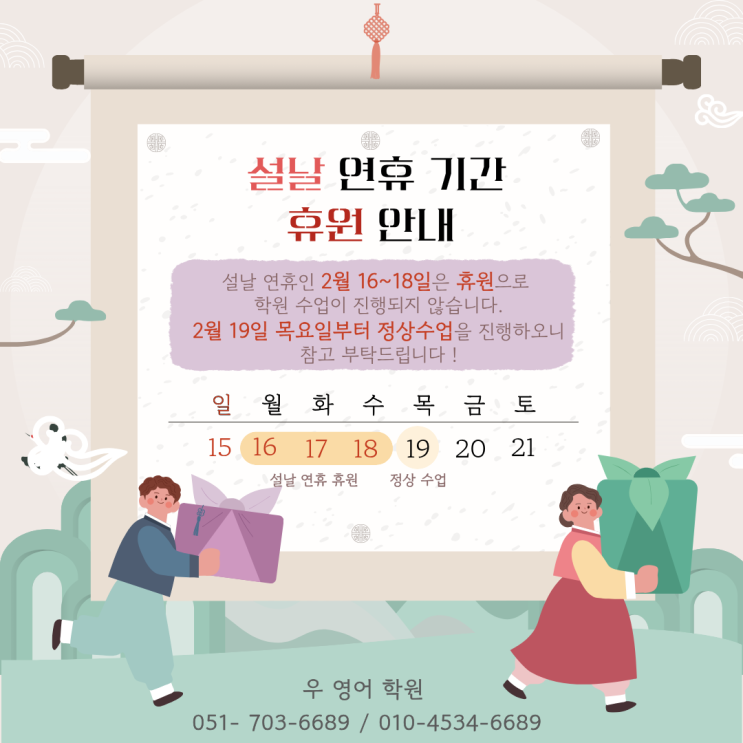 " 2월 16일 월요일 ~ 2월 18일 수요일 " 설 연휴로 인해 2월 16일(월)부터 18일(수)까지 학원 휴원으로 수업이 없습니다. **2월 19일(목)**부터는 정상적으로 수업이 진행됩니다. 새해를 맞아 항상 보내주시는 관심과 신뢰에 감사드리며, 가족과 함께 평안하고 뜻깊은 설 명절 보내시길 바랍니다. ♀️ <img src="https://blogthumb.pstatic.net/MjAyNjAyMDVfMTQ4/MDAxNzcwMjkyMjg1NTk1.hBaGNKC_LXrPspPhX94Emkqkb_isNS8R5Mlvj50xF4kg.LhtNWrOWe_JaWttpDmaZVY3WNrqQbKMLd5D1yFoQlCMg.PNG/%C1%A6%B8%F1%C0%BB_%C0%D4%B7%C2%C7%D8%C1%D6%BC%BC%BF%E4..png?type=s3" />