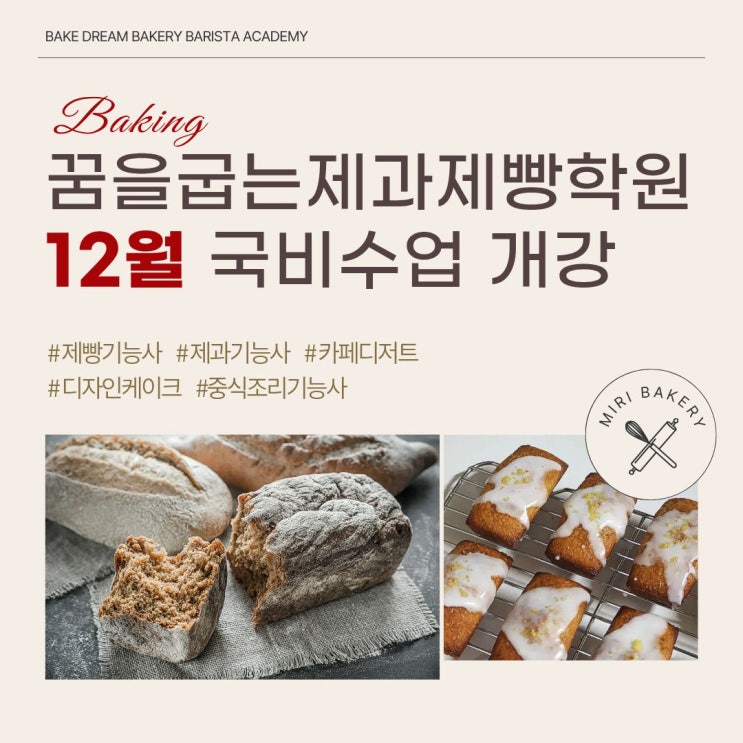 안녕하세요~ 꿈을굽는제과제빵학원입니다~ 2025년의 마지막 개강!! 12월 개강하는 국비수업 모집 안내 드립니다 ^^ 내년부터 자비부담금액이 인상예정이니 12월 개강반을 놓치지마세요!! 국비과정으로 금액은 저렴하지만 조별실습이 아닌 1인 1실습으로 실속있고 확실하게! 제빵기능사, 제과기능사 실기시험에 합격하고 싶은 분들은 서둘러 신청해주세요~ 국비과정은 "내일배움카드"발급을 받으신 분들은 누구나 참여 가능합니다^^ 내일배움카드 발급신청, 국비훈련 수강신청은 "고용24"홈페이지에서 가능합니다. 내일배움카드 발급, 과정문의, 수강신청 문의는 서구 구봉로 137, 밀리온빌딩 5층으로 방문하시거나 042-544-0....... <img src="https://blogthumb.pstatic.net/MjAyNTEyMTJfMjY4/MDAxNzY1NTIwMjgyNjU0.bAaxzY43jkp1gSNhPv-rZiR2IWZMKnf8gjUDTfuK_wwg.3lyCWxkIXWk-HkhCCdXzPv-3qsIlATgU0gK2CbsK7u8g.JPEG/12%BF%F9_%BA%ED%B7%CE%B1%D7_%BD%E6%B3%D7%C0%CF.jpg?type=s3" />