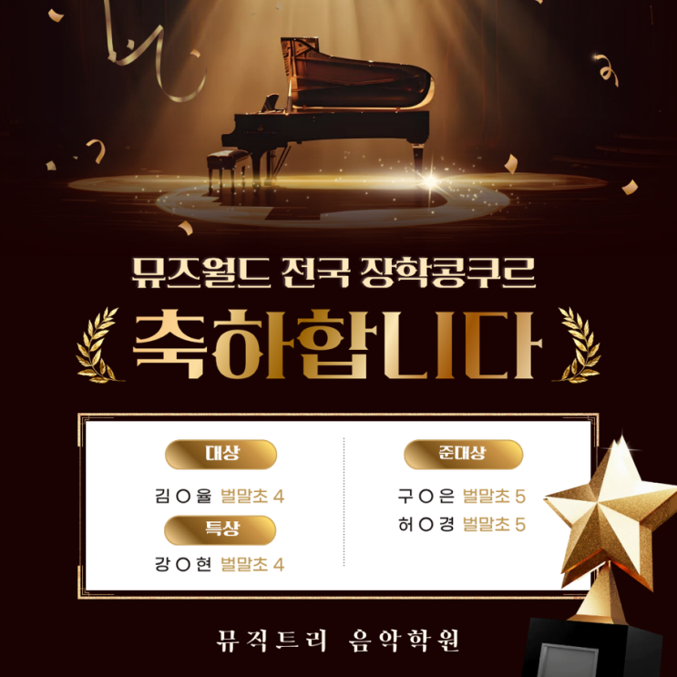콩쿨 입상을 축하합니다 우리뮤직둥이들❤️ Musictree Academy ✔️1:1 개별맞춤수업 ✔️이화여대 원장직강 레슨 ✔️다양한 특강 & 연주영상 ✔️학교에 따른 내신대비 수행평가 리코더, 단소, 소금 등 다양한 악기 특강 ✔️향상음악회 ✔️피아노 입문, 입시 전문학원 ✔️유아반, 초등반, 중•고등부, 성인반, 취미반, 콩쿨지도반, CCM, 반주법 완성 등 모두 가능 더 궁금하신 점은 학원으로 편하게 문의하시면 친절하게 상담 도와드리겠습니다^^ (아이들 수업시간을 보장하기 위해 미리 전화주셔서 예약을 잡아주시면 감사하겠습니다^^) 무료체험 수업도 1회체험수업으로 진행중이오니 편하게 전화로 미리 예약해주세요....... <img src="https://blogthumb.pstatic.net/MjAyNjAzMTdfMjEx/MDAxNzczNzMwMzY3OTM3.vt26VvvIUY7-HOXSFNIH1Dsffosyj-qTsPdPfdetxCkg.WYRxJyB7ucyLv-i_DpqW-yieQb47Ba6PHLhOzxUqn-Eg.PNG/%C1%A6%B8%F1%C0%BB_%C0%D4%B7%C2%C7%D8%C1%D6%BC%BC%BF%E4.%284%29.PNG?type=s3" />