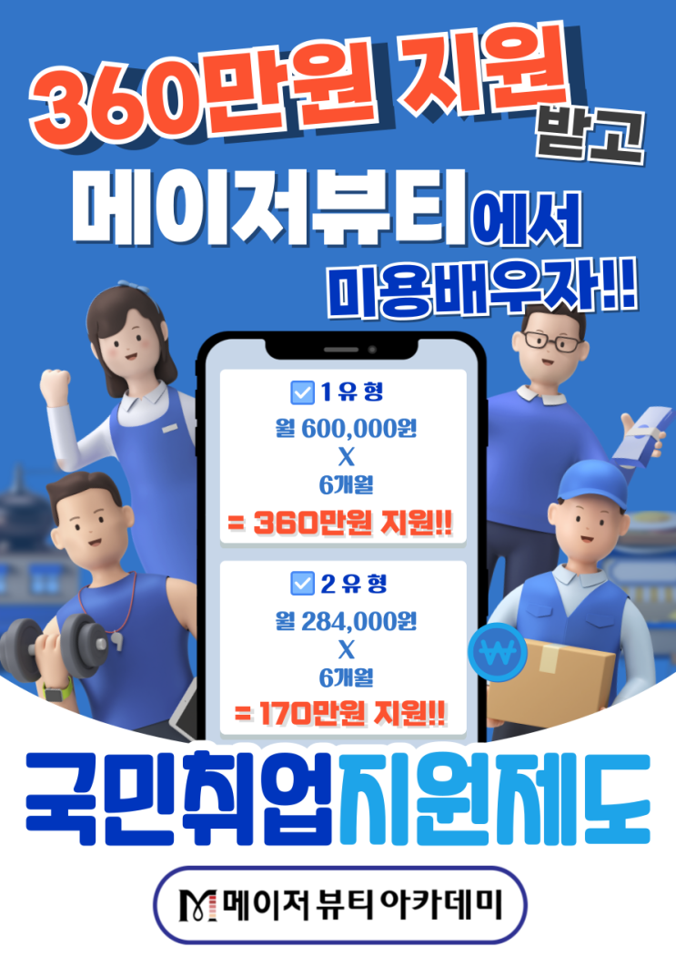 안녕하세요 :) 안양미용학원 메이저뷰티아카데미 안양평촌본원입니다. 미용 분야로 진로를 준비하시는 분들이라면 국가자격증 취득부터 실무 과정까지! 시간과 비용에 대한 고민을 한 뻔쯤은 해보셨을 텐데요~ 특히 학원비 부담 때문에 시작을 망설이시는 분들도 많더라구요! 이러한 부분때문에 망설이는 분들을 위해 오늘은 학원비 부담을 줄일 수 있는 방법 중에 하나인 국민취업지원제도에 대해서 안내드리려고 합니다 :) 국민취업제도란? 국민취업제도는 취업을 준비하는 분들을 대상으로 취업 상담 및 맞춤 코칭 직업훈련 연계 구직활동 지원금 지급 등 취업 준비에 대해 전반을 지원해주는 제도입니다! 단순하게 학원비만 지원해주는 것이....... <img src="https://blogthumb.pstatic.net/MjAyNjAzMThfMTky/MDAxNzczODAzOTI3Mzg5.TJypX7UUZ4MimnUy0ACDgiejEIZAYOKfc3nkU2UX3Xgg.Xiv_mM4aJM2-JC0pShV7jiYlMuiJSCCttQ0dfvf4cRQg.PNG/%BE%C8%BE%E7%B9%CC%BF%EB%C7%D0%BF%F8.png?type=s3" />