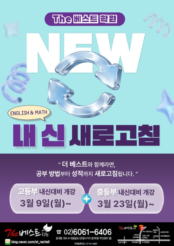 안녕하세요, 더베스트학원 원장 레이첼입니다. 방학 특강 기간 동안 학생들과 함께 꽤 타이트한 수업 일정을 보내고 나니 이제는 다시 내신대비 자료로 업무 리스트가 가득해지는 시기가 왔네요. ^^;; 이 시기가 되면 학부모님들께서 가장 많이 궁금해하시는 질문이 있습니다. "초등학교 때는 시험을 잘 보던 아이가 왜 중학교 시험에서는 점수가 생각보다 나오지 않을까요?" 학생의 학습태도가 갑자기 나빠진 것도 아니고, 초등학교 때보다 학원에서 공부하는 시간도 늘었는데 이런 변화가 생기는 이유는 무엇일까요? 그 이유는 생각보다 단순합니다. 중학교 시험은 초등학교와 평가 방식 자체가 다르기 때문입니다. 이유 1. 평가 범....... <img src="https://blogthumb.pstatic.net/MjAyNjAzMDVfNTIg/MDAxNzcyNzEzNzcyNjQ0.Z1ufh56q3Qyv5H4_OtTps1ULnuUt69PH24fbRWneDhUg.GhyC2IdfV9C-PbrtyGFf-EfVLhN7eW7aA_4rTFGgAyYg.JPEG/%B3%BB%BD%C5%B4%EB%BA%F1_%BB%F5%B7%CE%B0%ED%C4%A7.jpg?type=s3" />