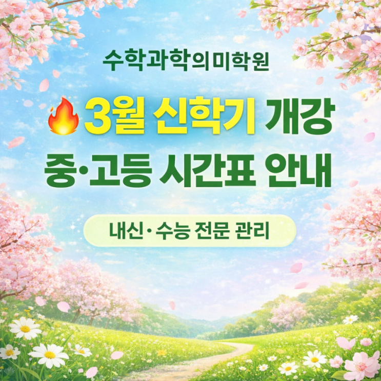 3월 신학기 개강 안내 서초동 수학학원 │ 수학과학의미학원 새 학기가 시작되는 3월은 학생의 성적 흐름이 결정되는 중요한 시기입니다. 수학과학의미학원은 학생 수준과 목표에 맞춘 개별 진도 관리 시스템으로 내신과 수능을 동시에 대비합니다. 중등부 시간표 안내 주 3회 수업 월 · 수 · 금 화 · 목 · 토 화 · 목 · 일 개념 완성 + 심화 문제 적용 + 시험 대비 주 2회 수업 월 · 금 화 · 목 수 · 토 수 · 일 기본기 강화 및 내신 대비 중심 관리 고등부시간표 서울고 · 서초고 · 상문고 · 은광여고 · 동덕여고 · 반포고 학교별 시험 유형을 분석하여 내신과 수능을 동시에 대비합니다. 수업 구성 주 3회 수업 회당 3시간 내신 + 수능 심화 관....... <img src="https://blogthumb.pstatic.net/MjAyNjAyMjNfMTc4/MDAxNzcxODIyNDg4NTE4.UqLhFO5tixpUHKM7hBPWRunUO2H9n8NLzN9THS_nWqog.ipCLkgnBbAXb_T2vfva-kD2vT50rJdlTroAXdpjNEkog.PNG/900%A3%DF1771822482893.png?type=s3" />
