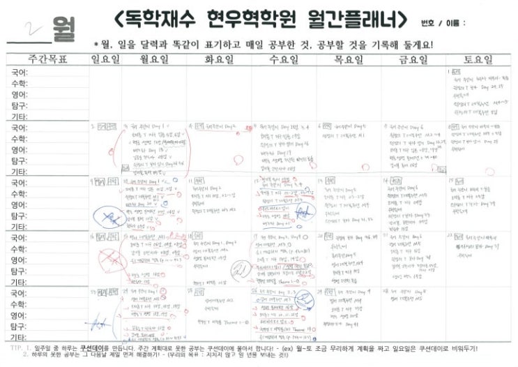 2026년 02월 월간플래너 입니다! 우리 독학재수 현우혁학원 학생들은 원장님의 일일학습점검을 통해 모든 학생들이 공부한 것을 확인받습니다! 책부터 인강수강내역까지 꼼꼼히 확인하시기에 학생들이 열심히 안 할수 없겠죠? 그럼 남은 기간도 힘내세요!! <img src="https://blogthumb.pstatic.net/MjAyNjAyMjVfMjk2/MDAxNzcxOTkzODAxMDY0.edK5KpWLJ_r2dUddR8c7cSKTG1q3kO5-XcU3DF3-ugQg.FWyuhKkovXHCLxjN40I-dZ1sOspQmNcld4CksZRTH8Ag.JPEG/0707_250227135642_001_5.jpg?type=s3" />