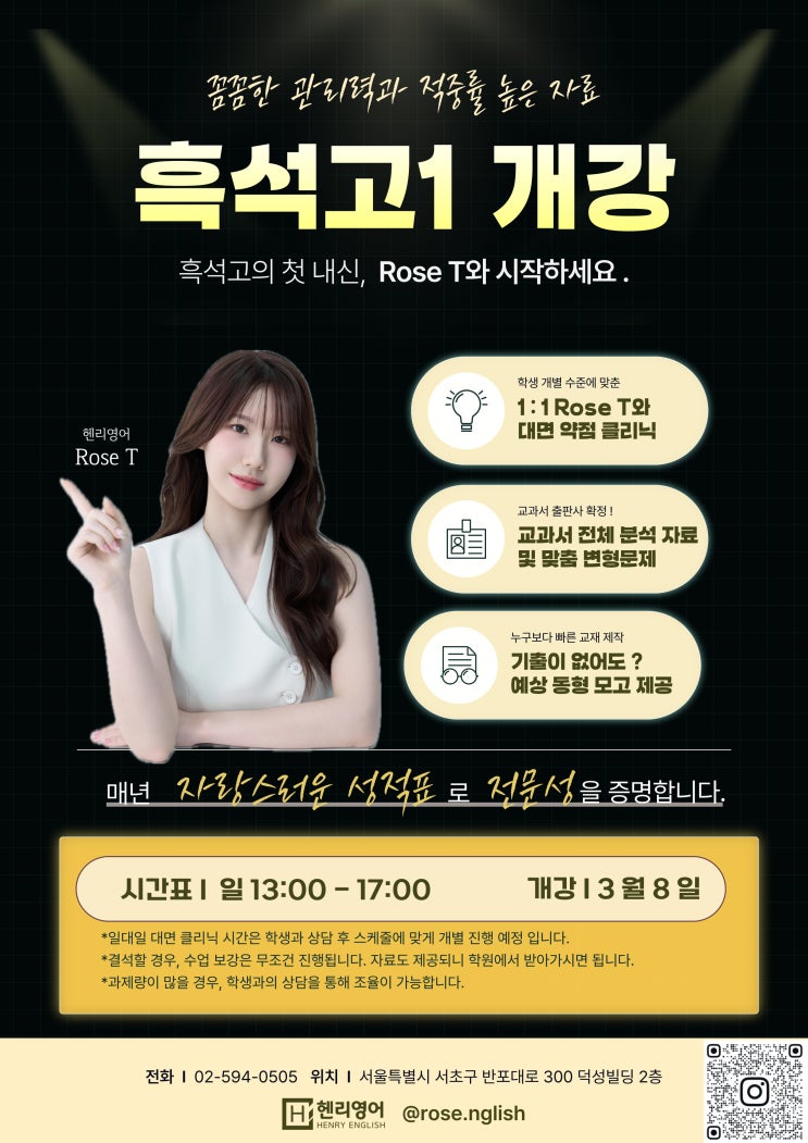 Henry English 진심을 다하고, 결과로 말하는 헨리영어 반포/서초 내신1등급 맞춤수업 ▶ 3/8(일) 개강 ! ▶ Rose Tr ▶ 주1회반 / 4시간 수업 ▶ 일요일 1시-5시 수업 - 1:1 클리닉 ! - 교과서 전체분석 자료 - 학교별 변형문제 - 예상 동형모고 제공 ! ** 수업전, 담임선생님 상담가능 ^^ 학부모와 학생 모두 가장 신뢰하는 브랜드 "헨리영어"와 함께라면 할 수 있습니다! T : 594-0505 <img src="https://blogthumb.pstatic.net/MjAyNjAyMjZfMTk4/MDAxNzcyMTAzMDA5Nzgw.A1tiCYpvzYxiG76jTuFA1dX2sJnVXAc6ZPryC9zSLlog.zMBCuta733DZkfNOy_Hk18Mv6HAu28rQQwQBRHdMnL0g.JPEG/%C8%E6%BC%AE%B0%ED.jpg?type=s3" />
